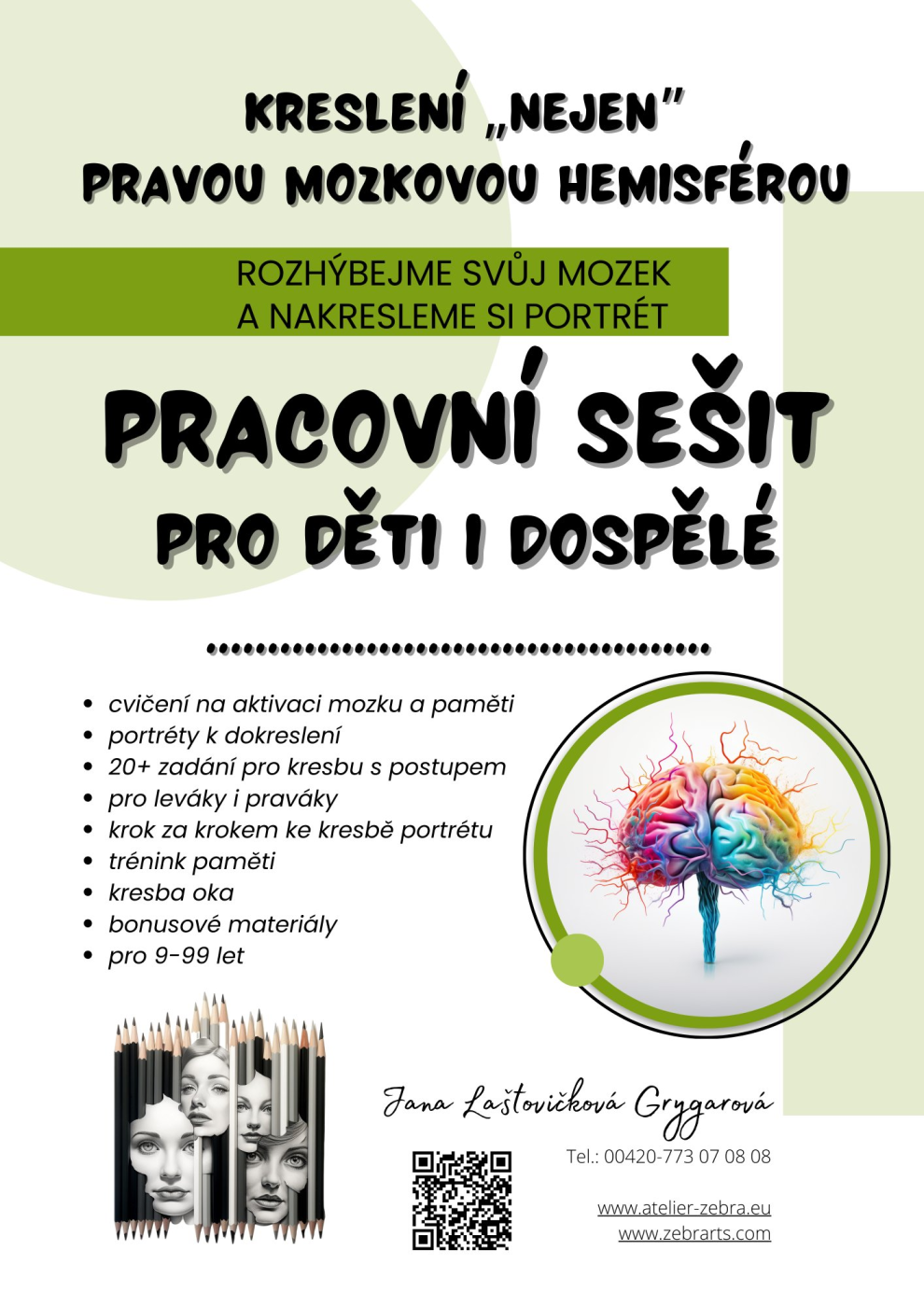 60 stran plných cvičení a tréninku paměti a kreslení. Přestaňte se omezovat vašimi představami a nechte se vést. Objevte kouzlo, kdy každá čárka najde své místo, a každý stín vyčaruje tajemství.Tento pracovní sešit je plný cvičení a návodů nejen na kreslení portrétů a dalších obrázků, ale zároveň i plný informací o našem mozku a návodů, jak mozek procvičovat, aby nezakrněl. Sešit je určen pro naprosté začátečníky, dospělé i děti od 9 let. Využít jej mohou i učitelé výtvarných výchov ve školách, a ukázat tím žákům netradiční jednoduché postupy při kreslení čehokoliv.Myslíte si, že neumíte kreslit? Vyvedu vás z omylu.Stačí pár tahů, a stane se zázrak.Přestaňte se omezovat vašimi představami a nechte se vést.Objevte kouzlo, kdy každá čárka najde své místo, a každý stín vyčaruje tajemství. O autorce: Jsem lektorkou kurzů kreslení pravou mozkovou hemisférou a tyto podklady používám na svých kurzech jako pomůcku pro mé studenty, aby měli všechny informace z absolvovaného kurzu pohromadě a mohli si případně doma některá cvičení zopakovat, dopracovat, a dále trénovat kreslení tak, aby se zlepšovali, a aby se jednou dopracovali třeba až k hyperrealistické kresbě. Jak říkám svým studentům, vše je jen o tom, že Vám někdo ukáže „jak na to“ a pak je to již jen na Vás, zda budete trénovat, nebo ne. Pokud jste se naučili psát, naučíte se. Své obrázky, nakreslené díky instrukcím v tomto pracovní sešitu, mi pak můžete poslat. Pokud si nebudete vědět s něčím rady, nebo se Vám zadání bude zdát nejasné, jsem Vám kdykoliv k dispozici na info@atelier-zebra.eu, případně mne naleznete na Facebooku.