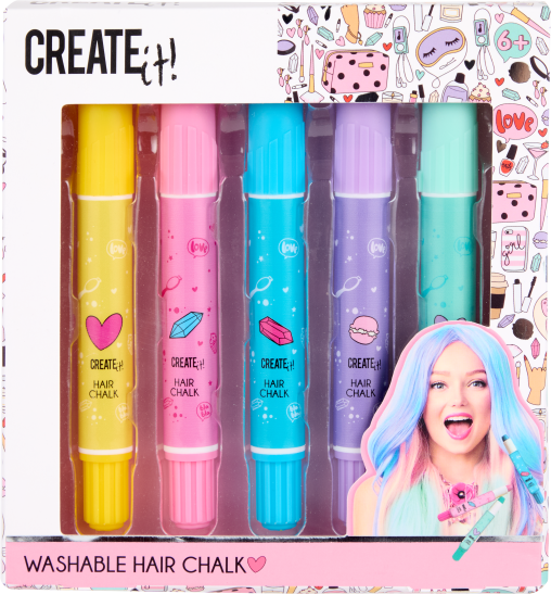Křídy na vlasy v tužce Creat it! 5 ks – balení obsahuje 5 ks barevných kříd na vlasy v praktické tužce. Velmi jednoduché použití. Barvy – světle růžová, tyrkysová, zelená, fialová a tmavo růžová.