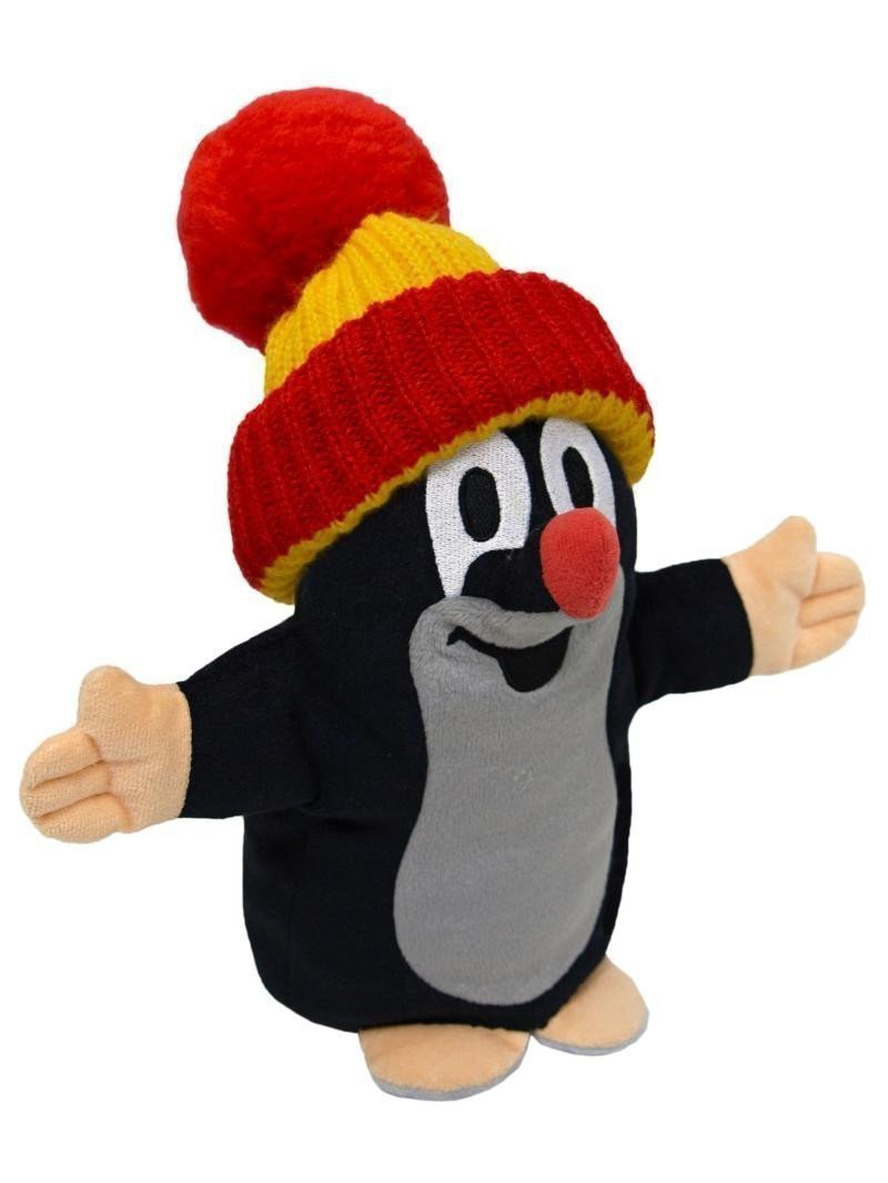 Plyšový maňásek na ruku, mírně vycpaný, oči vyšívané, s červeno-žlutou pletenou sundavací čepicí. Praní na 40°C.Pro děti bez omezení věku.