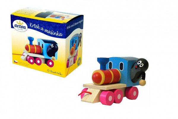 Tahací dřevěná mašinka s Krtečkem jako strojvedoucím. Výrobek splňuje požadavky EU na bezpečnost hraček a je vhodný pro děti od 3 let. Baleno v papírové krabičce o rozměrech 125 x 105 x 75 mm. © Zdeněk Miler
