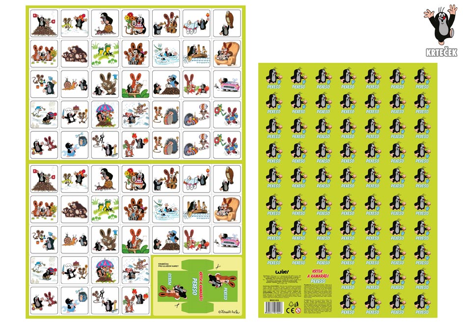 Krtek pexeso vystřihovací Krtek a kamarádi Vystřihovací pexeso Krtek a kamarádi. Pexeso je tradiční stolní hra, která slouží k procvičování paměti a soustředění. Hra rozvíjí schopnost zapamatovat si, kde se jednotlivé obrázky nacházejí, a podporuje tak kognitivní dovednosti, především paměť a koncentraci. Pexeso je oblíbené mezi dětmi, ale také dospělými, protože je zábavné a jednoduché na pochopení.Návod ke hře pexeso:Pexeso mohou hrát nejméně dva hráči. Všechny rozstříhané kartičky se zamíchají a rozloží obrázkem dolů do čtverce 8 x 8 kartiček. Nesmí se při tom dívat na obrázek. Hráči si určí pořadí hry. Hráči postupně otáčejí vždy dvě kartičky s cílem najít dvojice se stejnými obrázky. Pokud hráč najde dvojici, ponechá si ji a pokračuje v tahu. Pokud ne, kartičky se otočí zpět lícem dolů a hraje další hráč.Cílem hry je nasbírat co nejvíce dvojic, a tím se stát vítězem.Papír: křída matná 350 g + lamino lesk 1/1Velikost hracích karet: 51 cm x 51 cm