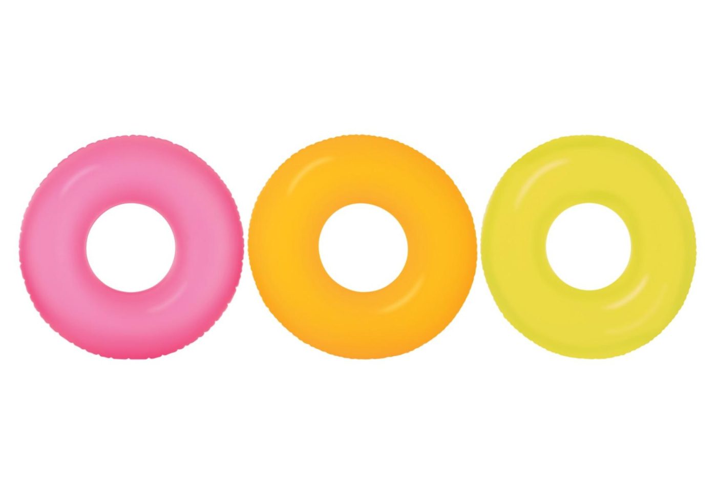 Plovací kruh ve žluté, oranžové a neonově růžové barvě, vyrobeny z pevného vinylu. 91 cm