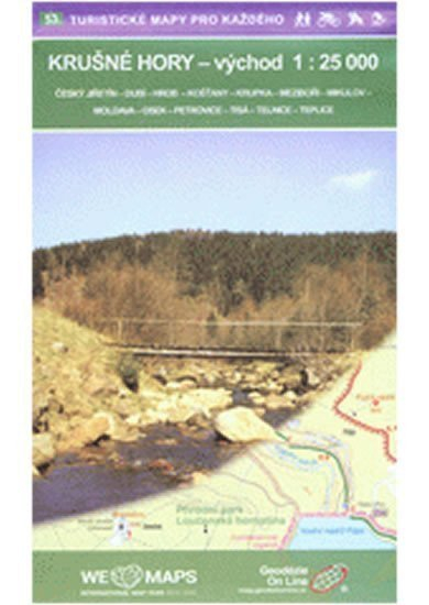 Krušné hory - východ = Erzgebirge - Ost : Český Jiřetín, Dubí, Hrob, Košťany, Krupka, Meziboří, Mikulov, Moldava, Osek, Petrovice, Tisá, Telnice, Teplice : turistická, cykloturistická a lyžařská mapa . Mapy 1:25 000 od společnosti Geodezie On-Line. Podrobná mapa zobrazuje základní polohopisné a výškopisné informace např. silnice, zpevněné a nezpevněné cesty,železnici, sídla a jejich části včetně osad a samot, vodní plochy a toky, ostatní plochy (např. lesy, zahrady a sady, vinice, chmelnice), výškové kóty, vrstevnice po 10 m, ... Mapa dále obsahuje pásové a místní turistické značení, turistické směrovníky, kilometráž; cykloturistické trasy; naučné stezky; turistické lyžařské trasy, sjezdové tratě, lanovky a vleky; jezdecké trasy a samozřejmě zobrazuje pro turisty atraktivní místa - hrady a zámky, rozhledny a místa rozhledu, zříceniny a jiné památky, muzea a galerie, koupaliště, vybrané restaurace a ubytovací zařízení,...