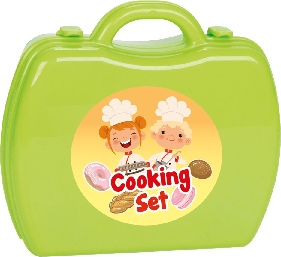 Kuchyňský kufřík – obsahuje vybavení – talíře, příbory, kastroly, hrnečky, plastové potraviny. Lehce rozložitelný a přenostný v praktickém kufříku.