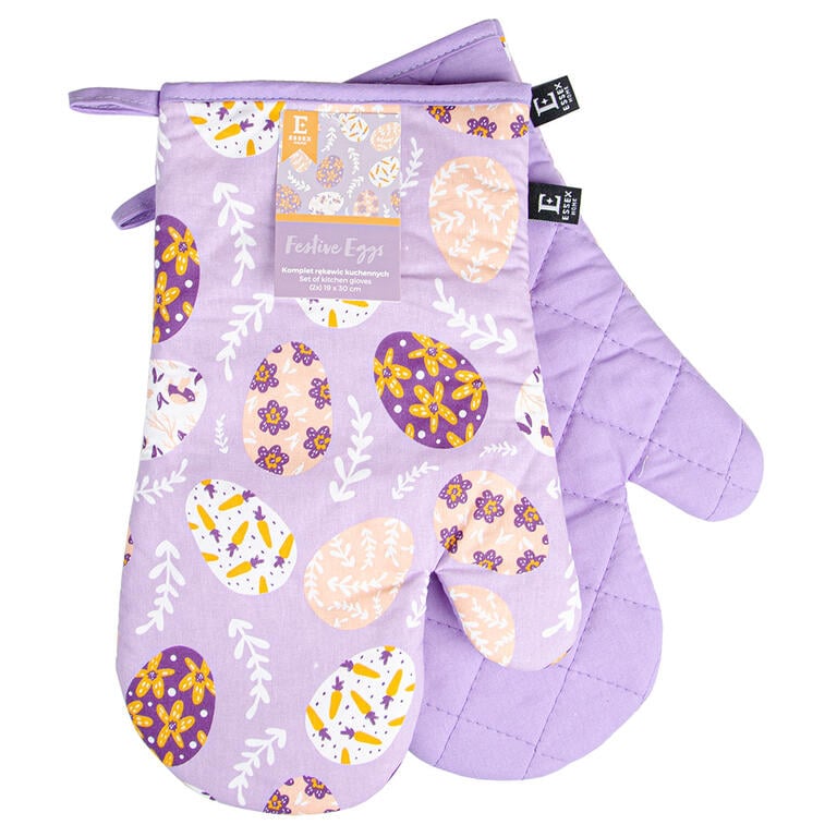 Sada kvalitních kuchyňských chňapek v krásné levandulové barvě s velikonoční tematikou pro pravou a levou ruku je nepostradatelným a praktickým pomocníkem při pečení i vaření. Chňapky jsou opatřeny poutkem na zavěšení. Jedna strana je potištěná kresbou kraslic, druhá strana je jednobarevná.