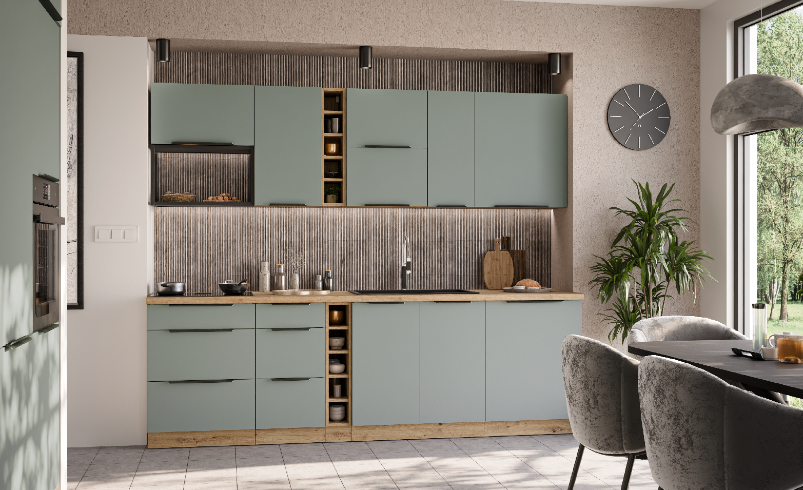 Kuchyňská linka Aria 1 Vlastnosti: Materiál Laminovaná dřevotřísková deska o síle 16 mm Zakončené hrany ABS hrana o síle 1 mm Anti Finger Print Jedná se o speciální povrchovou úpravu, kdy na povrchu dvířek / čel zásuvek nezůstávají otisky prstů. Úchyt Matný kovový černý úchyt Sokl Součástí balení Vnitřní barva Vnitřek skříněk je bílá Panty / Pojezdy Panty a pojezdy s tlumeným zavíráním • • Barevné kombinace K dispozici je celkem 5 barevný kombinací - 1 barevná varianta korpusu a 5 barevných variant dvířek. Dub artisan korpus BL - Black AFM dvířka / čela zásuvek SA - Aquamarine AFM dvířka / čela zásuvek TA - Sandgrau AFM dvířka / čela zásuvek GR - Graphite AFM dvířka / čela zásuvek WH - Crystal white AFM dvířka / čela zásuvek • Rozměry kuchyňské linky Aria 1 255 cm celková šířka 36 cm a 71,5 cm výška horních skříněk libovolná celková výška 60 cm hloubka spodních skříněk s pracovní deskou 82 cm výška spodních skříněk bez pracovní desky 29 cm a 31 cm hloubka horních skříněk • Skříňky použité v této kuchyňské sestavě Horní skříňky 1 x 60 GU-36 1F1 x Police One Loft1 x 40 G-72 1F1 x 15 G-72 OTW2 x 50 GU-36 1F1 x 30 G-72 1F1 x 60 G-72 1FSpodní skříňky1 x 60 D 3S BB1 x 40 D 3S BB1 x 15 D OTW BB1 x 80 ZL 2F BB (dřezová skříňka)1 x 60 D 1F BB • Pracovní desky ke kuchyňské lince Pracovní deska není v ceně, ale je možné si jí dokoupit v libovolné délce a provedení.Potřebný rozměr pracovní desky pro tuto kuchyňskou linku je 255 cm. Dub Lancelot - 38 mm Zjistit více... Bílá - 28 mm Zjistit více... Nubian - 28 mm Zjistit více... Dub Artisan - 38 mm Zjistit více... • Montážní závěsná lištaMontážní lišta je chytré řešení pro efektivní a snadnou instalaci horních skříněk ve vaší kuchyni nebo jiných prostorách. Nejprve se lišta upevní ke zdi, což zajistí stabilní a rovný základ pro následné zavěšení skříněk. • Odkazy na příslušenství ke kuchyňským linkámKompletní nabídka skříněk ke kuchyňské lince AriaPracovní deskyPříslušenství ke kuchyním •