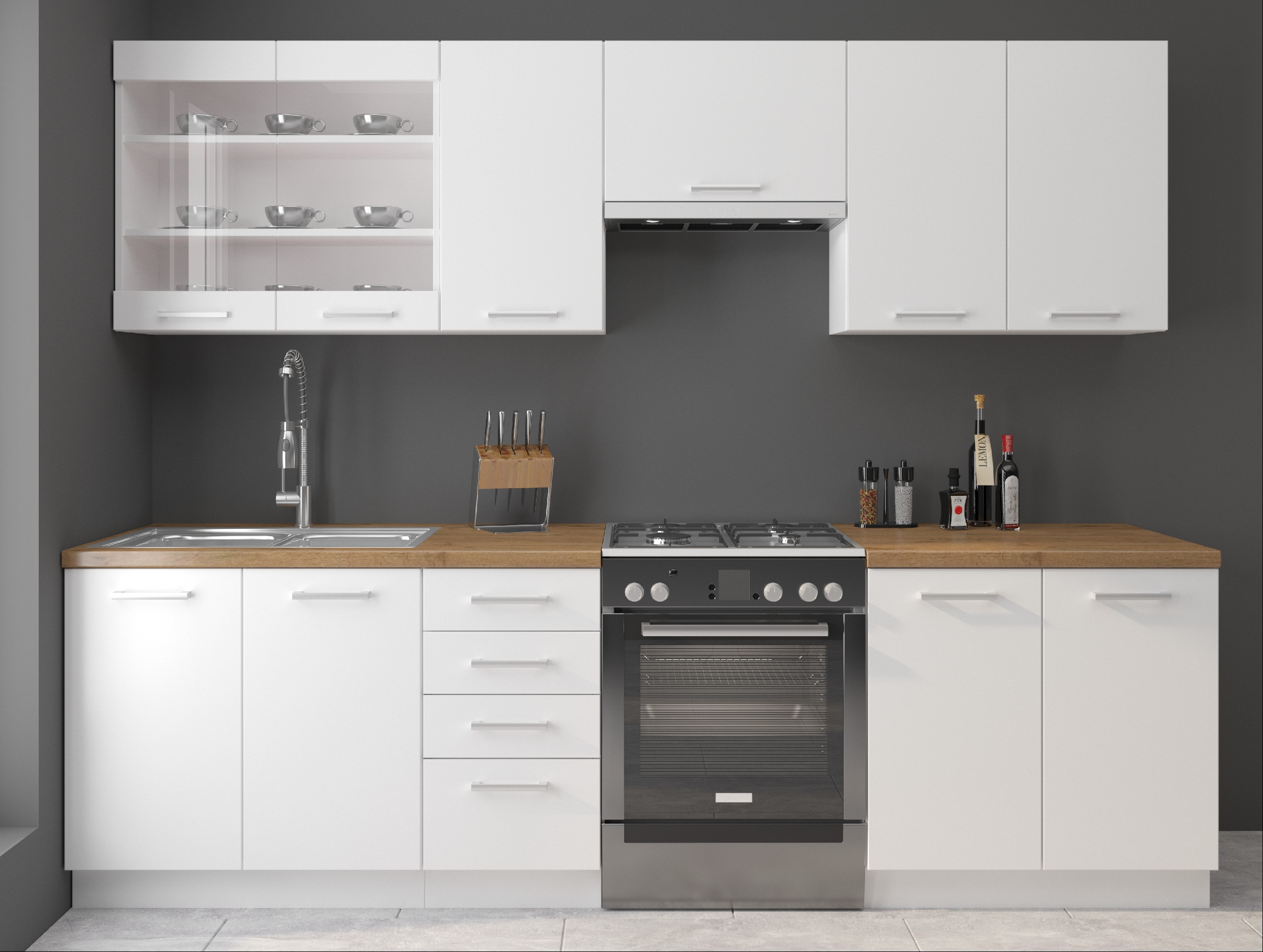 Kuchyňská linka Eko 2 Kuchyňská linka Eko bílá je moderním a praktickým řešením pro vaši kuchyň. Nabízí prostornost a variabilní umístění skříněk, což umožňuje přizpůsobit uspořádání vašim potřebám. Elegantní design a kvalitní materiály zaručují dlouhou životnost, ideální pro každou domácnost. • Barevná varianta kuchyňské linkyDvířka skříněk a zásuvek jsou v bílé matné barvě. Korpus kuchyňské linky je také bílý. • Vlastnosti kuchyňské linky Eko 2 Korpus a dvířka Korpusy a dvířka jsou vyrobena z laminované desky o síle 16 mm. Hrany desek Hrany opatřeny ABS hranou o síle 1 mm nebo dýhou. Úchytky Jednotlivá dvířka a zásuvky se otevírají pomocí kovových úchytek. BEZ tichého dovírání Dvířka a zásuvky NEJSOU opatřeny tichým dovíráním. Vnitřek skříněk Vnitřek skříněk je bílý. • Rozměry kuchyňské linky Eko 2 260 cm celková šířka 71,5 cm výška horních skříněk variabilní celková výška 60 cm hloubka spodních skříněk s pracovní deskou 82 cm výška spodních skříněk 31 cm hloubka horních skříněk Horní skříňky lze umístit do libovolné výšky. • Skříňky použité v této kuchyňské sestavě Horní skříňky1 x 80 GS-72 2F (2x prosklená dvířka)1 x 40 G-72 1F (1x dvířka)1 x 60 OK-40 1F (2x dvířka)1 x 60 G-72 2F (2x dvířka)Spodní skříňky1 x 80 ZL 2F BB (skříňka pod dřez - 2x dvířka)1 x 40 D 4S BB (4x šuplík)1 x 80 D 2F BB (2x dvířka) • Pracovní desky ke kuchyňské lince Pracovní deska není v ceně, ale je možné si jí dokoupit v libovolné délce a provedení. Potřebný rozměr pracovní desky pro tuto kuchyňskou linku je 200 cm. Dub Lancelot - 38 mm Zjistit více... Bílá - 28 mm Zjistit více... Nubian - 28 mm Zjistit více... Dub Artisan - 38 mm Zjistit více... • Montážní závěsná lištaMontážní lišta je chytré řešení pro efektivní a snadnou instalaci horních skříněk ve vaší kuchyni nebo jiných prostorách. Nejprve se lišta upevní ke zdi, což zajistí stabilní a rovný základ pro následné zavěšení skříněk. • Odkazy na příslušenství ke kuchyňským linkámPracovní deskyPříslušenství ke kuchynímKompletní nabídka skříněk ke kuchyňské lince Eko bílá •