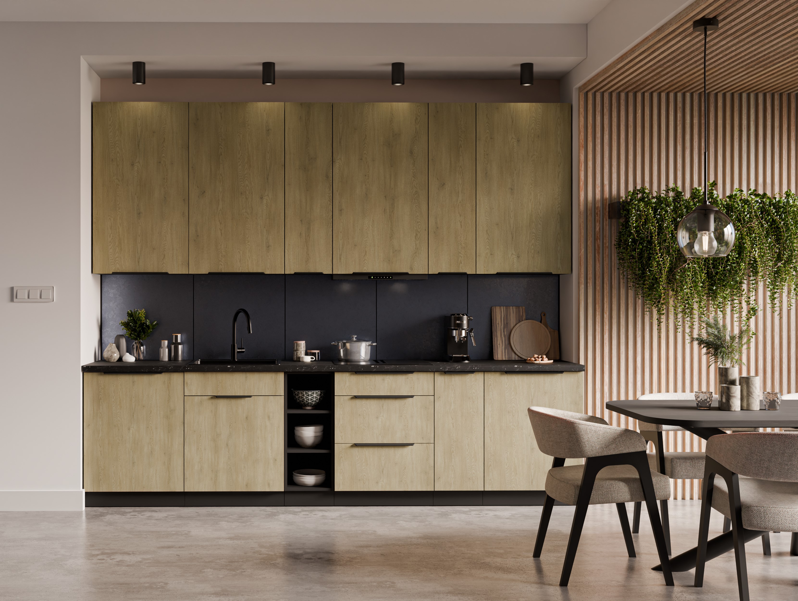 Kuchyňská linka Cremona 3 Vlastnosti Materiál Laminovaná dřevotřísková deska o síle 16 mm Zakončené hrany ABS hrana o síle 1 mm Úchyty Matné kovové černé úchyty Sokly spodních skříněk Součástí každé spodní skříňky Vnitřní barva Vnitřek skříně je bílý Panty / Pojezdy Panty a pojezdy s tlumeným zavíráním • Barevné kombinace Černá a Dub Cremona Korpus a dvířka Bílá a Dub Cremona Korpus a dvířka • Rozměry kuchyňské linky Cremona 3 300 cm celková šířka 108 cm výška horních skříněk libovolná celková výška 60 cm hloubka spodních skříněk s pracovní deskou 82 cm výška spodních skříněk bez pracovní desky 31 cm hloubka horních skříněk • Skříňky použité v této kuchyňské sestavě Horní skříňky4 x 60 G-108 1F2 x 30 G-108 1FSpodní skříňky2 x 60 D 1F BB1 x 60 ZL 1S BB (dřezová skříňka)1 x 30 D OTW BB1 x 60 D 3S BB1 x 30 D CARGO BB • Pracovní desky ke kuchyňské lince Pracovní deska není v ceně, ale je možné si jí dokoupit v libovolné délce a provedení.Potřebný rozměr pracovní desky pro tuto kuchyňskou linku je 300 cm. Dub Lancelot - 38 mm Zjistit více... Bílá - 28 mm Zjistit více... Nubian - 28 mm Zjistit více... Dub Artisan - 38 mm Zjistit více... • Montážní závěsná lištaMontážní lišta je chytré řešení pro efektivní a snadnou instalaci horních skříněk ve vaší kuchyni nebo jiných prostorách. Nejprve se lišta upevní ke zdi, což zajistí stabilní a rovný základ pro následné zavěšení skříněk. • Odkazy na příslušenství ke kuchyňským linkámKompletní nabídka skříněk ke kuchyňské lince CremonaPracovní deskyPříslušenství ke kuchyním •