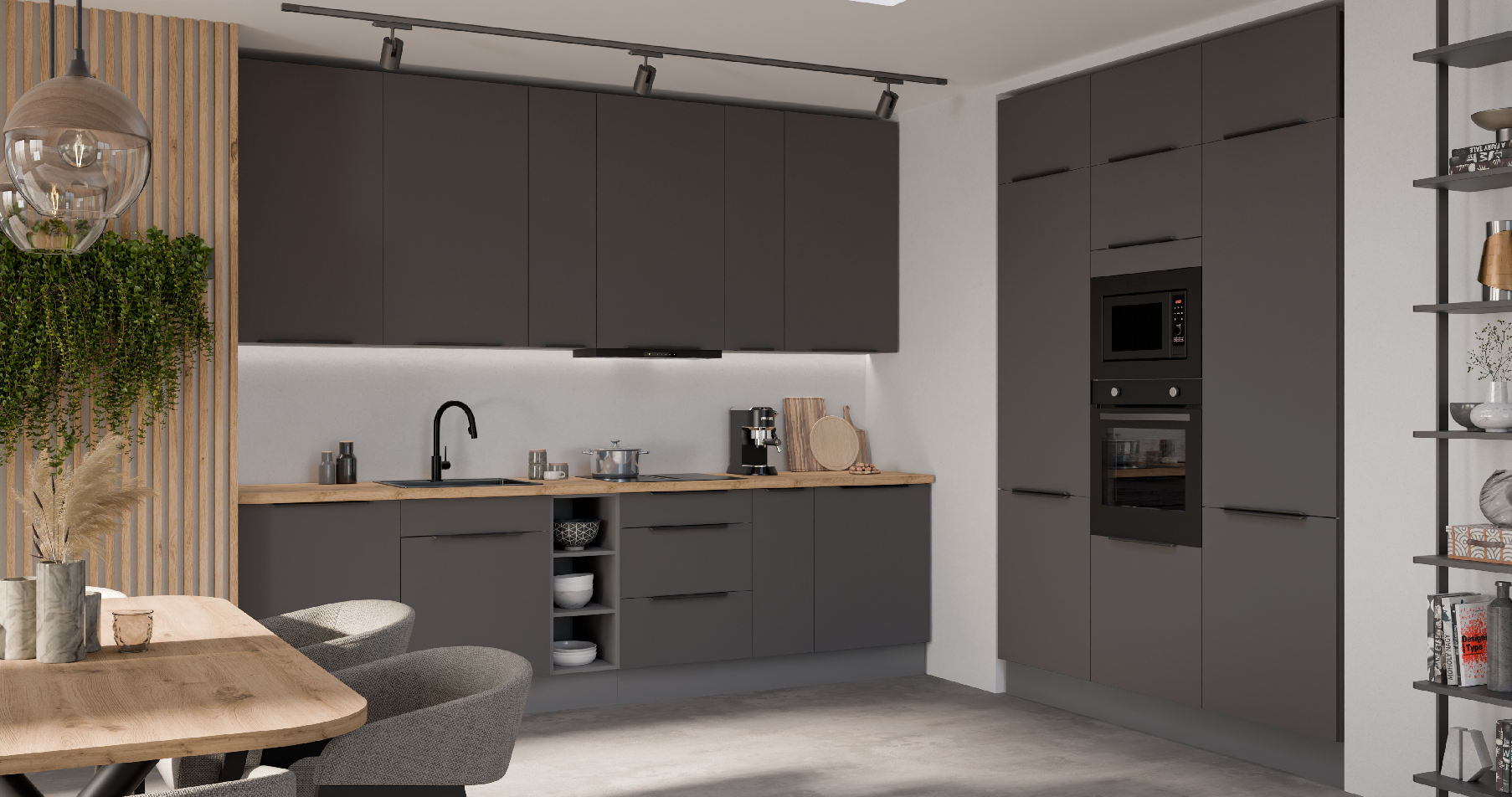 Kuchyňská linka Aria ANT Vlastnosti: Materiál Laminovaná dřevotřísková deska o síle 16 mm Zakončené hrany ABS hrana o síle 1 mm Anti Finger Print Jedná se o speciální povrchovou úpravu, kdy na povrchu dvířek / čel zásuvek nezůstávají otisky prstů. Úchyt Matný kovový černý úchyt Sokl Sokl NENÍ součástí balení - lze doobjednat Nastavitelné nožičky Skříňka stojí na nastavitelných nožičkách: 13,5 - 16 cm Vnitřní barva Vnitřek skříně je bílý Panty / Pojezdy Panty, pojezdy a plynové písty s tlumeným zavíráním • • Barevné kombinace Antracit Korpusy GR - Graphite AFM Dvířka a čela zásuvek • Rozměry kuchyňské linky Aria ANT 300 x 180 cm celková šířka 36 cm a 108 cm výška horních skříněk libovolná celková výška 60 cm hloubka spodních skříněk s pracovní deskou 82 cm výška spodních skříněk 31 cm a 57 cm hloubka horních skříněk • Skříňky použité v této kuchyňské sestavě Horní skříňky4x 60 G-108 1F2x 30 G-108 1F3x 60 NAGU-36 1FSpodní skříňky2 x 60 D 1F BB 1 x 60 ZL 1S BB (dřezová)1 x 30 D OTW BB1 x 60 D 3S BB1 x 30 D CARGO BBVysoké skříně 1 x 60 LO-210 2F (pro vestavnou lednici)1 x 60 DPM-210 2F (pro vestavnou troubu a mikrovlnou troubu)1 x 60 DK-210 2F (potravinová skříň) • Sokl ke kuchyňské linceSpodní skříňky stojí na nastavitelných nožičkách, tím pádem není součástí skřínek spodní krycí sokl. Ten je možné dokoupit hned v několika rozměrech. Manipulace s ním je snadná. • Pracovní desky ke kuchyňské lince Pracovní deska není v ceně, ale je možné si jí dokoupit v libovolné délce a provedení. Potřebný rozměr pracovní desky pro tuto kuchyňskou linku je 300 cm.Pracovní desky • Montážní závěsná lištaMontážní lišta je chytré řešení pro efektivní a snadnou instalaci horních skříněk ve vaší kuchyni nebo jiných prostorách. Nejprve se lišta upevní ke zdi, což zajistí stabilní a rovný základ pro následné zavěšení skříněk. Montážní lišta • Odkazy na příslušenství ke kuchyňským linkámKompletní nabídka skříněk ke kuchyňské lince Aria ANTPracovní deskyPříslušenství ke kuchyním •