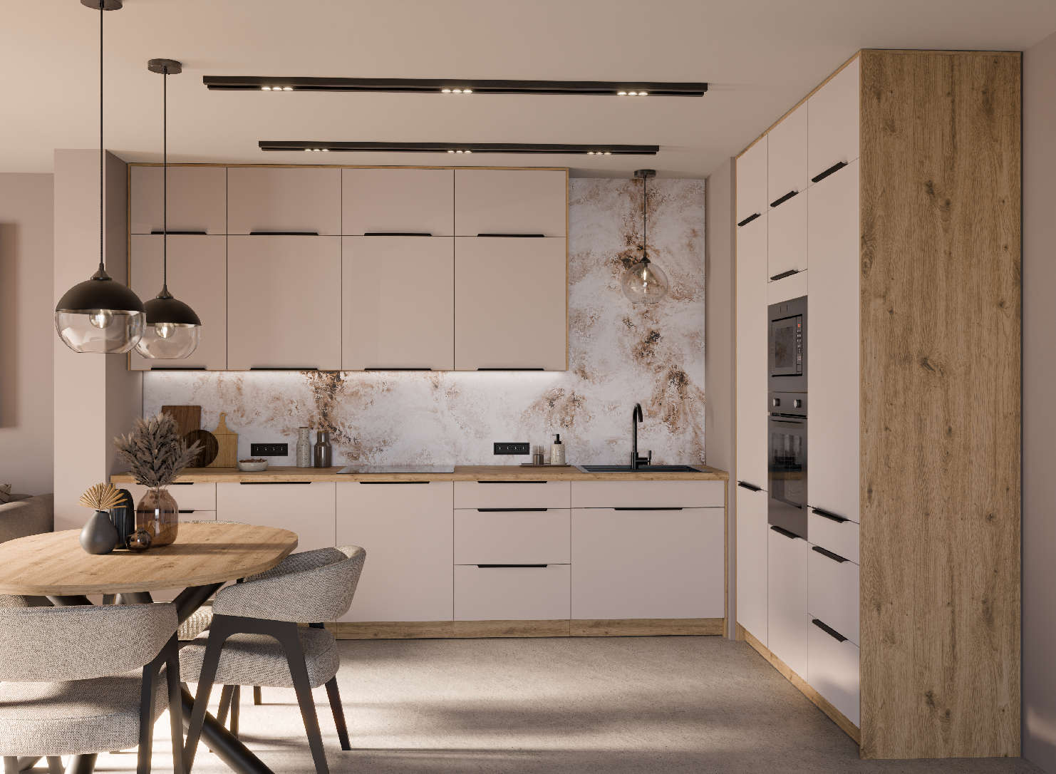 Kuchyňská linka Solea 3 Vlastnosti Materiál Laminovaná dřevotřísková deska o síle 16 mm Zakončené hrany ABS hrana o síle 1 mm Úchyty Matné kovové černé úchyty Sokly spodních skříněk Součástí každé spodní skříňky Vnitřní barva Vnitřek skříně je bílý Panty / Pojezdy Panty, pojezdy a plynové písty s tlumeným zavíráním • Barevná kombinace Dub artisan korpus Kašmír dvířka a čela zásuvek • Rozměry kuchyňské linky Solea 3 310 x 180 cm celková šířka 71,5 a 36 cm výška horních skříněk libovolná a cca 250 cm celková výška 60 cm hloubka spodních skříněk s pracovní deskou 82 cm výška spodních skříněk bez pracovní desky 31 cm hloubka horních skříněk • Skříňky použité v této kuchyňské sestavě Horní skříňky1 x 50 G-72 1F1 x 50 G-36 1F3 x 60 G-72 1F6 x 60 G-36 1FSpodní skříňky1 x 50 D 1F 1S BB 2 x 60 D 1F BB 1 x 60 D 3S BB1 x 80 ZL 1S BBVysoké skříňky1 x 60 LO-210 2F (pro vestavnou lednici)1 x 60 DPM-210 2F (pro vestavnou troubu a mikrovlnou troubu) 1 x 60 DKS-210 3S 1F (potravinová skříň) • Pracovní desky ke kuchyňské lince Pracovní deska není v ceně, ale je možné si jí dokoupit v libovolné délce a provedení.Potřebný rozměr pracovní desky pro tuto kuchyňskou linku je 310 cm. Dub Lancelot - 38 mm Zjistit více... Bílá - 28 mm Zjistit více... Nubian - 28 mm Zjistit více... Dub Artisan - 38 mm Zjistit více... • Montážní závěsná lištaMontážní lišta je chytré řešení pro efektivní a snadnou instalaci horních skříněk ve vaší kuchyni nebo jiných prostorách. Nejprve se lišta upevní ke zdi, což zajistí stabilní a rovný základ pro následné zavěšení skříněk. • Odkazy na příslušenství ke kuchyňským linkámKompletní nabídka skříněk ke kuchyňské lince SoleaPracovní deskyPříslušenství ke kuchyním •