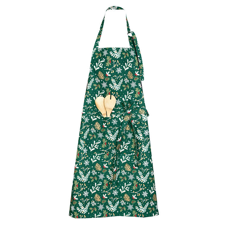 Kuchyňská zástěra v tradiční zelené barvě s motivy jehličí, jmelí a sněhových vloček má pohodlný střih s krčním popruhem, dlouhé vázání v pase a velkou kapsu na vařečky či utěrku.