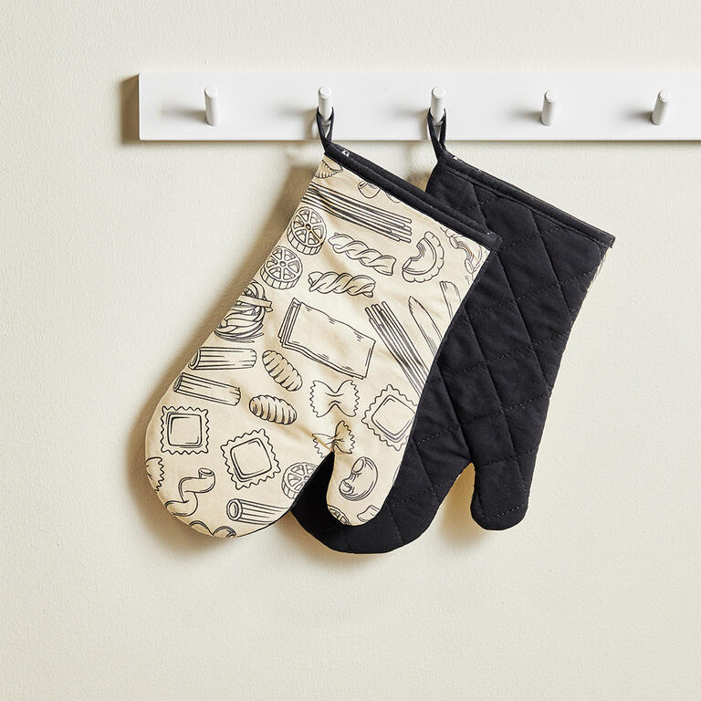 Sada kvalitních originálních kuchyňských chňapek bude nepostradatelným pomocníkem a zároveň ozdobou vaší kuchyně. Jedna chňapka v krémové barvě s kresbičkami italských těstovin, druhá celočerná. Chňapky jsou prošívané a jsou opatřeny poutkem na zavěšení.