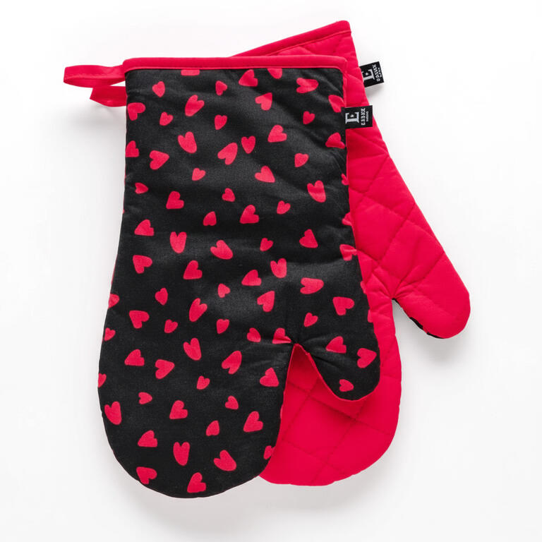 Sada kvalitních originálních kuchyňských chňapek bude nepostradatelným pomocníkem a zároveň romantickou ozdobou vaší kuchyně. Jedna strana červená, druhá černá s červenými srdíčky. Chňapky jsou prošívané a jsou opatřeny poutkem na zavěšení.