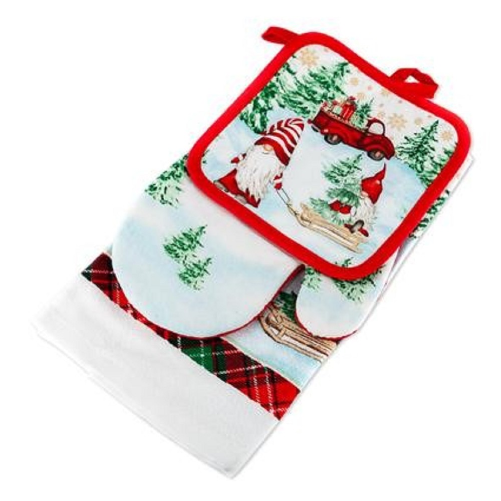 Vánoční kuchyňský set obsahující rukavici, chňapku a utěrku - různé vzory foto ilustrační Všechny tyto pomůcky Vám budou nejen praktickým pomocníkem ale i vhodným módním doplňkem Vaší kuchyně. Všechny části setu mají praktické poutko pro zavěšení. Materiál - povrch - 100% bavlna, výplň chňapky a rukavice - 65% bavlna, 35% polyester.