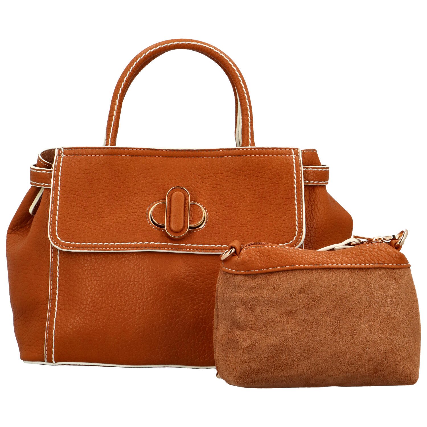 Ozdobný překlop na zámeček, který dominuje přední straně, vás ihned zaujme. Prošívání a bílé lemy doplňují styl kabelky.Hlavní kapsa se uzavírá magnetickým drukem a uvnitř najdete menší kabelku, kterou využijete jako toaletní tašku a nebo po přidání dlouhého popruhu, jako crossbody.