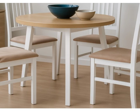 Klasický jídelní stůl o průměru 100 cm v dekoru dub artisan/bílý má kulatý tvar a hodí se do každé kuchyně a jídelny.