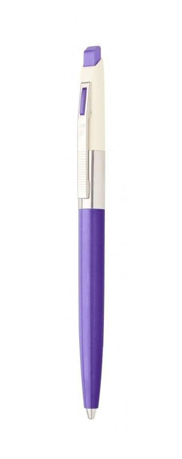 Kuličkové pero v pastelově fialové barvě s kovovým klipem, vycvakávacím mechanismem a silným hrotem 0,8 mm.