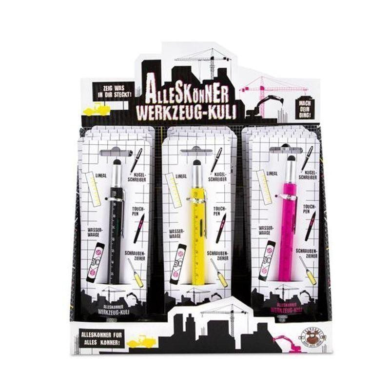 Všestranné kuličkové pero s 5 různými funkcemi! Dotykové pero, pravítko o délce 10 cm, vodováha, štěrbinový a křížový šroubovák a kdo by si to pomyslel, umí také psát! To vše v jednom kuličkovém peru – perfektní jako dárek! S vyměnitelnou náplní, černým písmem.