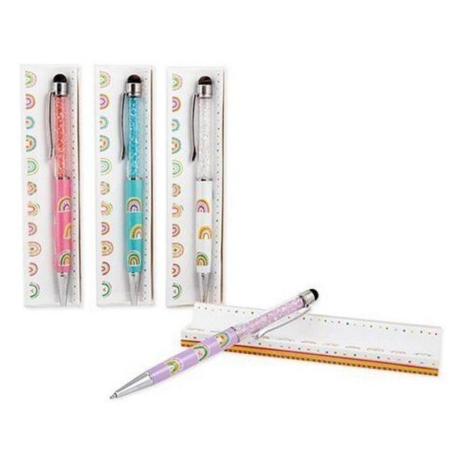 Toto kovové kuličkové pero s třpytivými kamínky a duhovým designem zaručeně vnese dobrou náladu do vašeho každodenního života. Díky dodatečné funkci dotykového pera je flexibilně všestranný. Baleno v krásné krabičce, je to také ideální dárek.Modré písmo s vyměnitelnou náplní. K dispozici ve 4 různých barvách: fialová, růžová, tyrkysová a bílá. Velikost: cca 14,5 cm x O 1 cm