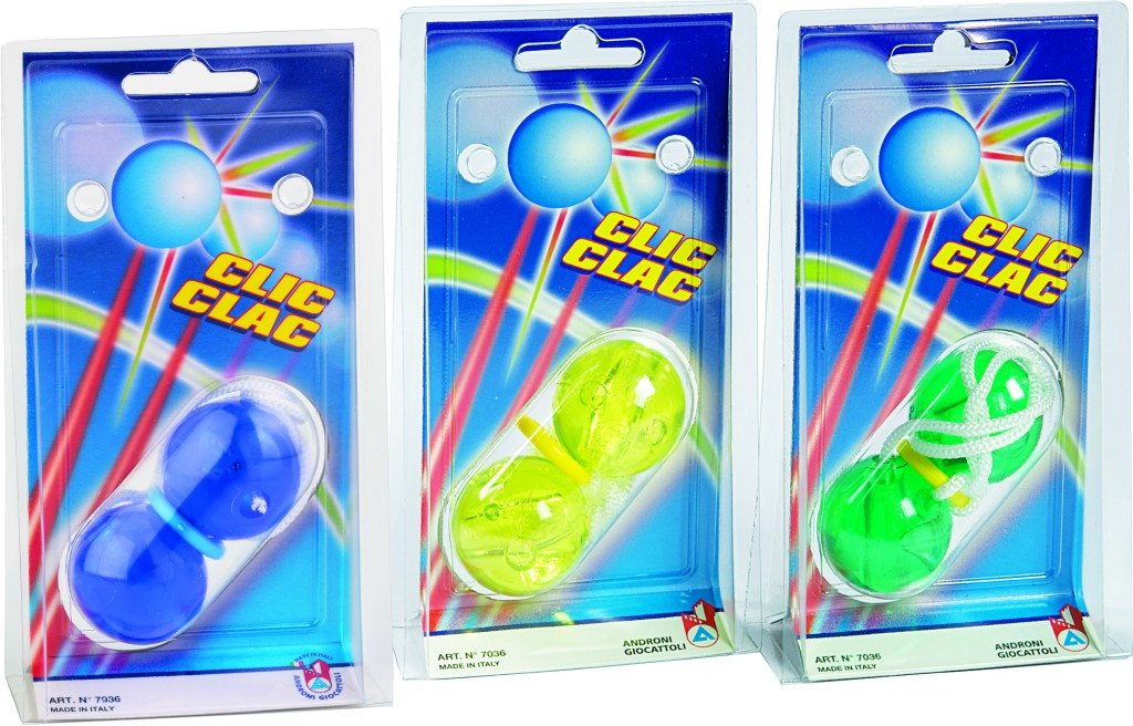 Kuličky na šňůrce Klik Klak – tato hračka se skládá ze dvou pevných kuliček zavěšených na provázku, který je uprostřed spojen úchytem nebo kroužkem. Cílem je rytmickými pohyby ruky rozhoupat kuličky tak, aby o sebe narážely nad rukou i pod rukou, a vydávaly tak charakteristický zvuk „klik-klak“. V různých barevných variantách.
