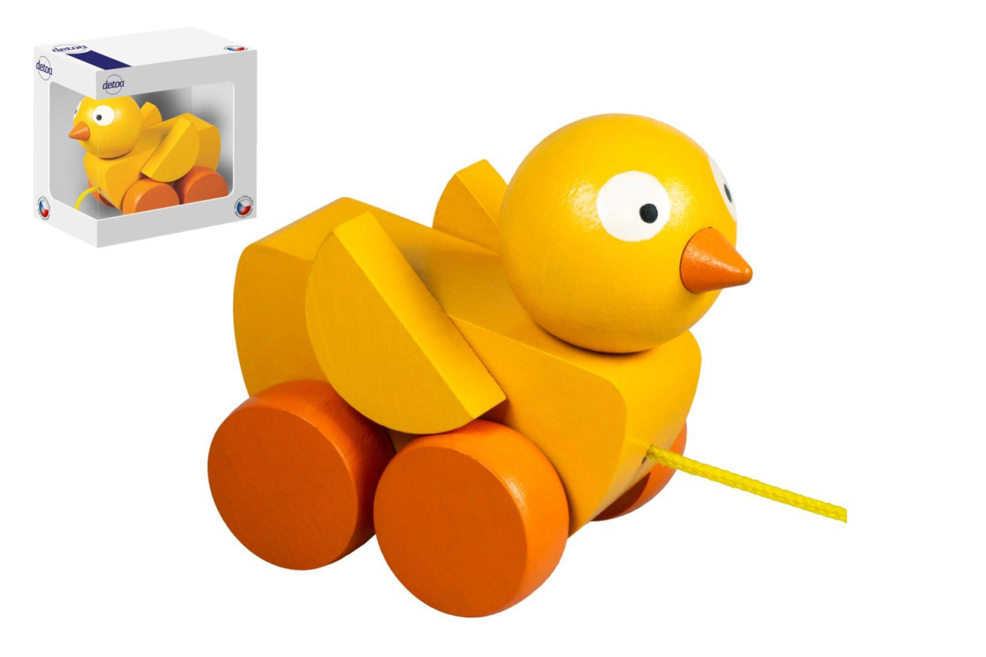 Tahací hračka kuře. Kuře doprovází děti při jejich prvních krůčcích. Rozměry výrobku jsou 95x64x85 mm. Baleno v papírové krabičce. Varování: nevhodné pro děti mladší 12 měsíců. Dlouhá šňůra. Nebezpečí uškrcení