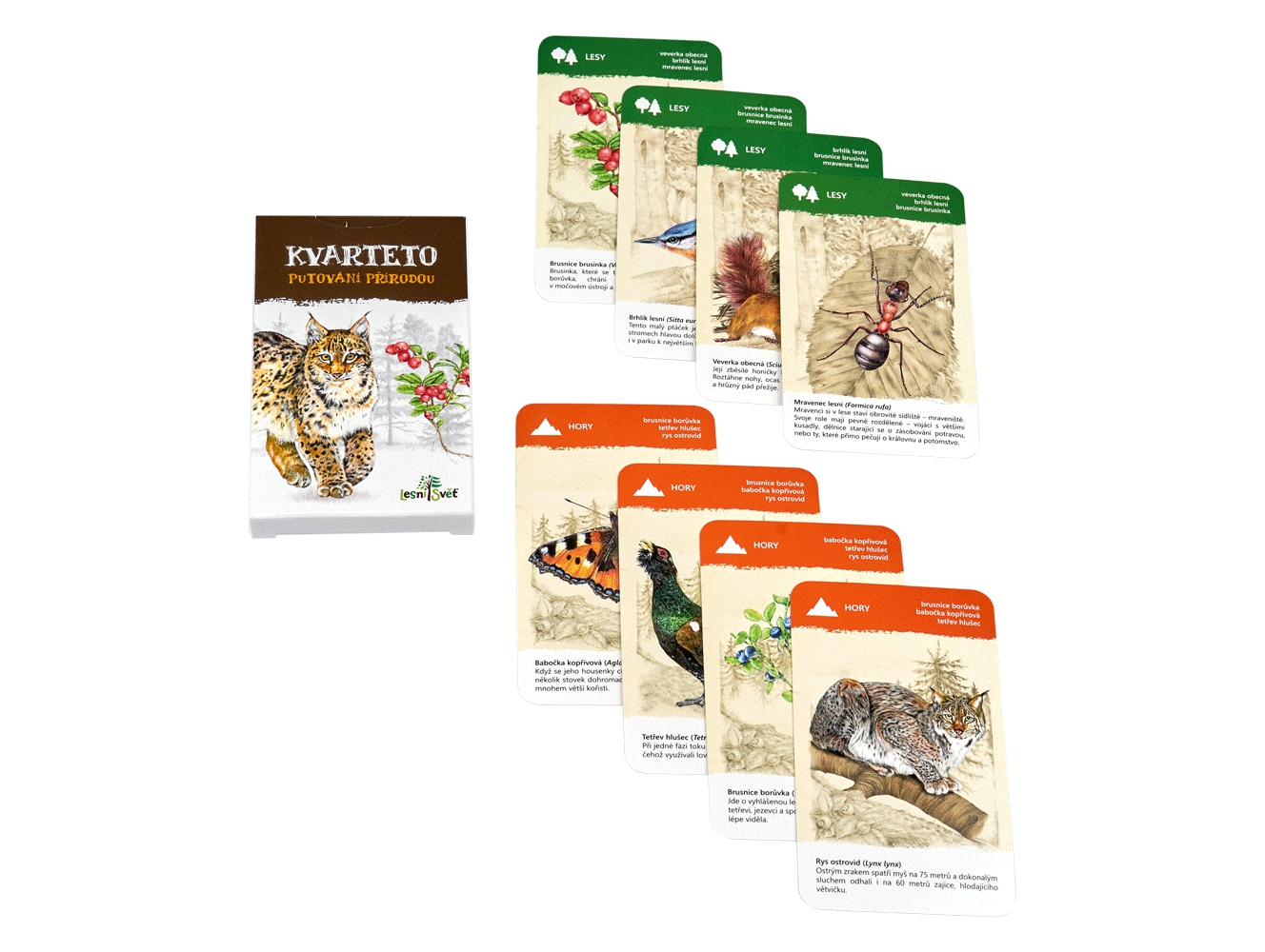 Vytištěno na ekologickém papíře s certifikátem PEFC. Balení obsahuje 32 herních karet. Rozměr karty: 6 cm x 10 cm Nemá ochranný obal. Autorem kreseb jsou čeští ilustrátoři, obrázky jsou chráněny autorskými právy. Kvarteto zábavnou a hravou formou seznamuje děti i dospělé s přírodou. Obsahují 8 biotopů - město, křovina, hory, mýtina, louka, mokřad, lesy, rybník. Lesní svět = značka s ekologickým certifikátem udržitelného hospodářství PEFC. Všechny výrobky jsou vyrobeny s ohledem na životní prostředí.