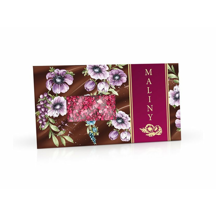 Složení: cukr, kakaové máslo, sušené plnotučné mléko, kakaová hmota, sušená syrovátka (z mléka), nasekaná malina (2%), emulgátor: sójový lecitin, přírodní aroma. Obsah kakaové sušiny v mléčné čokoládě minimálně 31 %. Obsah mléčné sušiny v mléčné čokoládě minimálně 19 %. Zdroj vápníku. Vápník 170 mg. Informace pro alergiky: Obsahuje mléko a sóju. Může obsahovat arašídy a ořechy a obiloviny obsahující lepek. Hmotnost: 100 g