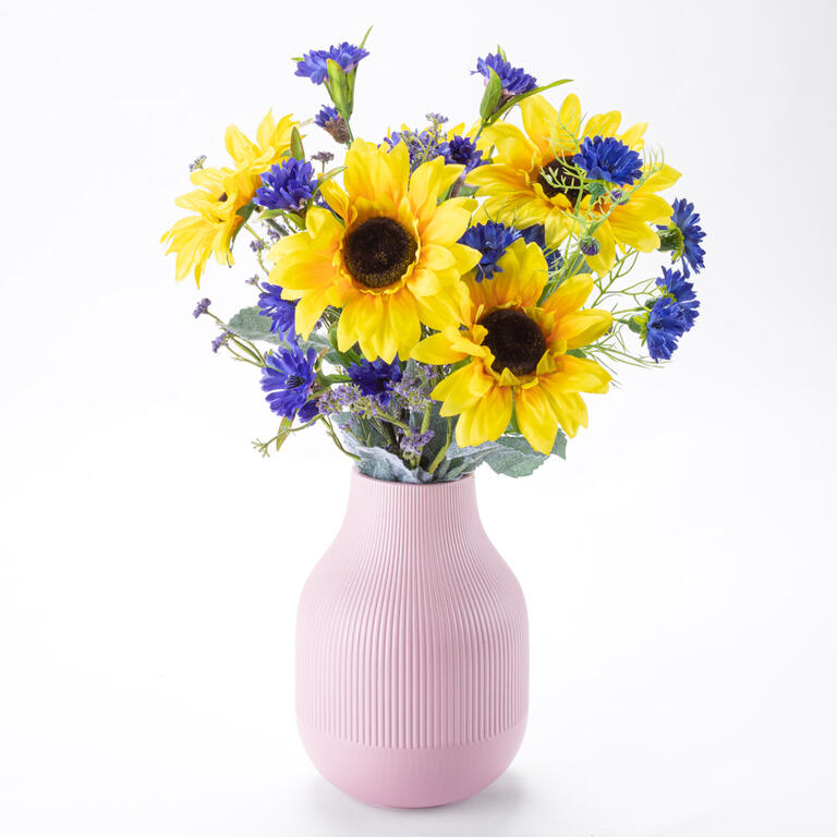 Okouzlující kytice umělých květin je na první pohled k nerozeznání od těch živých. Kytici vévodí slunečnice, dalším výrazným prvkem je modrá chrpa, modrý cosmos a celek citlivě dotváří gypsophila v barvě lila. Bohatou kytici tvoří celkem 8 stonků. Tato krásná dekorativní kytice ozdobí letní jídelní stůl, bude vám dělat radost na konferenčním či nočním stolku nebo báječně doplní venkovní posezení.