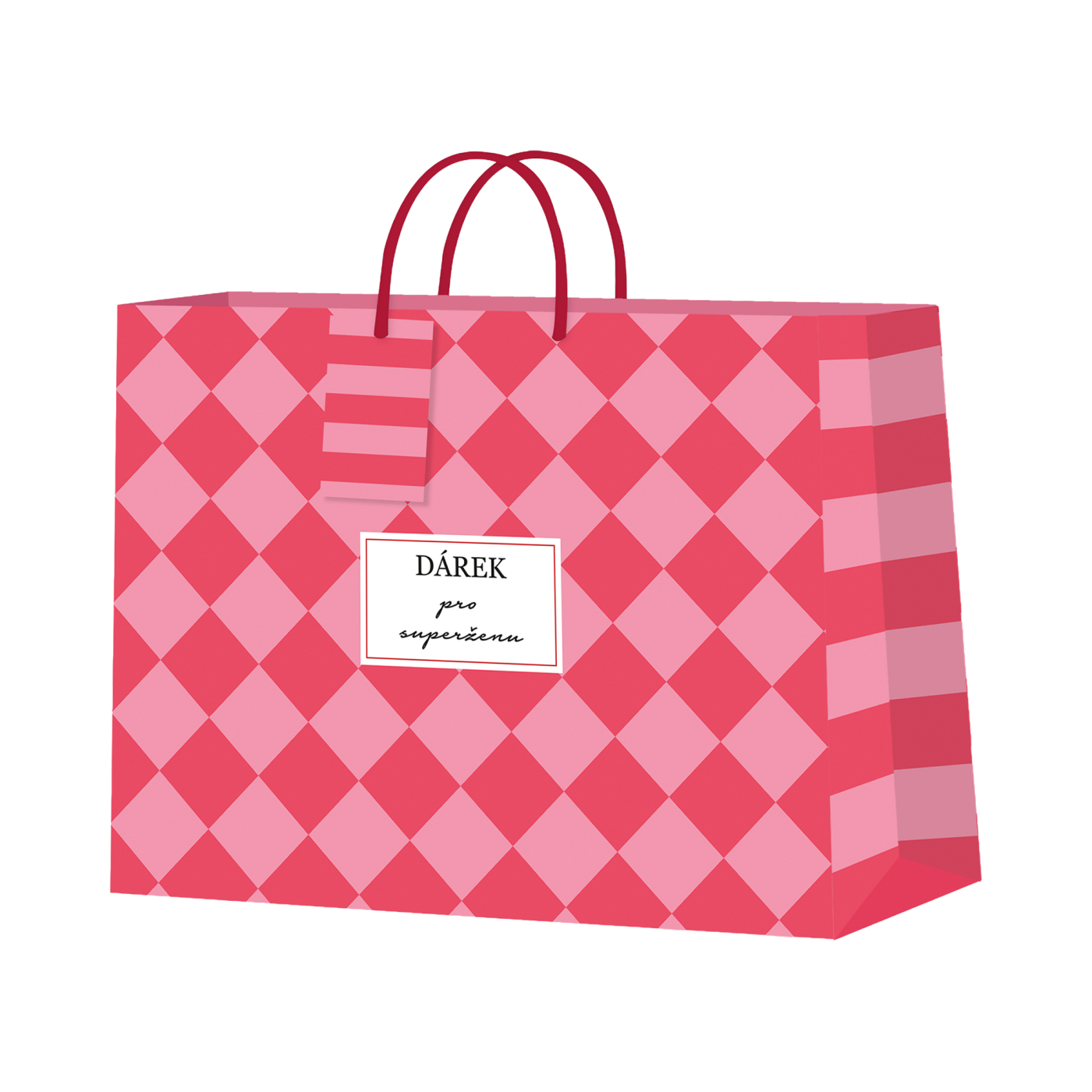 Široká papírová taška s motivem červeno-růžové šachovnice a nápisem Dárek pro superženu. Rozměry: 32,4 × 12,7 × 26 cm
