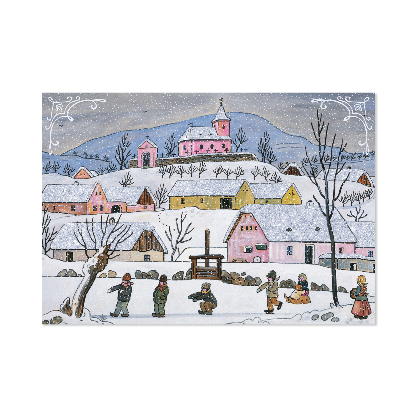 Klasické vánoční přání s motivy od Josefa Lady. Uvnitř přání naleznete krátkou báseň s milým věnováním. Text uvnitř přání: Po nebi něžně poletuje sníh, krajinu zahalí bílá peřina, všude se ozývá dětský smích, nejkrásnější čas v roce už začíná. Příjemné prožití vánočních svátků a šťastný nový rok. Rozměry: 13,5 × 19,5 cm