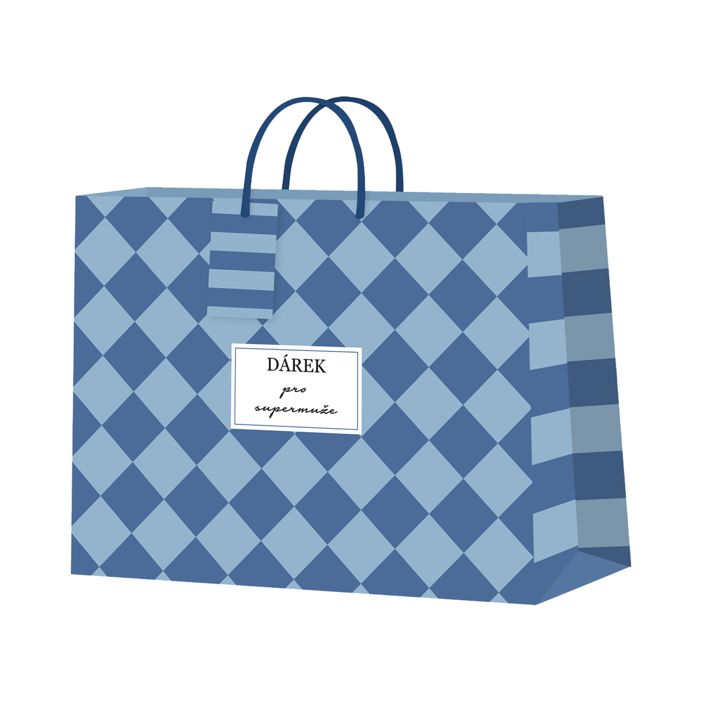 Široká papírová taška s motivem modré šachovnice a nápisem Dárek pro supermuže. Rozměry: 32,4 × 12,7 × 26 cm