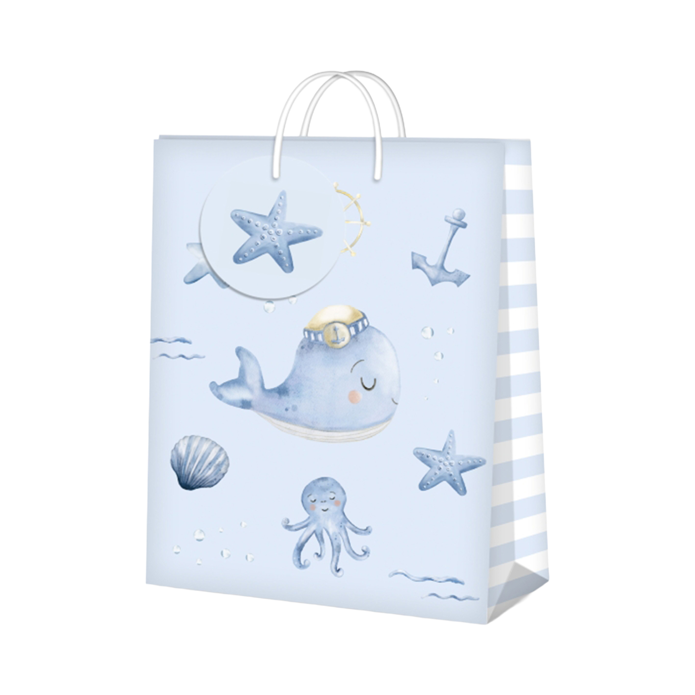 Modrá papírová dárková taška s dětským motivem velryby. Rozměry: 26 × 12,7 × 32,4 cm (šířka × hloubka × výška)