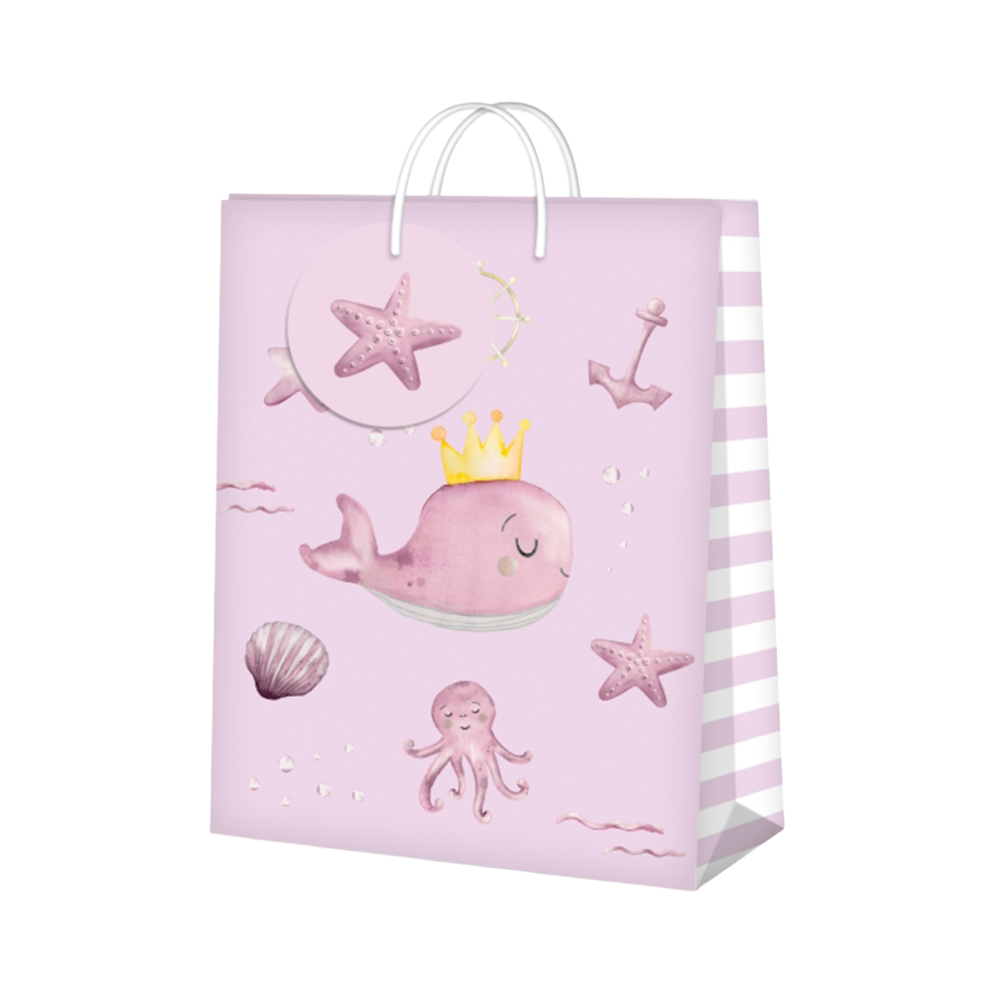 Růžová papírová dárková taška s dětským motivem velryby. Rozměry: 26 × 12,7 × 32,4 cm (šířka × hloubka × výška)
