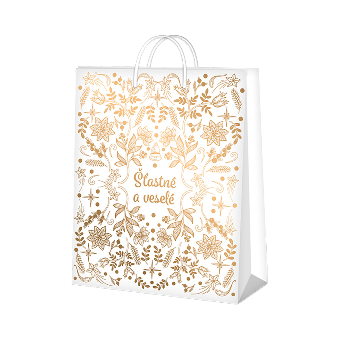 Bílá vánoční papírová taška se zlatou ražbou a nápisem Šťastné a veselé. Rozměry: 26 × 12,7 × 32,4 cm