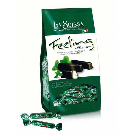 Hořké čokoládové tyčinky plněné mátovou náplní Vychutnejte si osvěžující chuť máty v italské hořké čokoládě Složení: cukr, kakaová hmota, rosltinné tuky, suš.odstředěné mléko, suš.syrovátka, kakaové máslo, emulgátor: sojový lecitin, mátový esenciální olej(0,2%), přírodní aroma: vanilka Hořká čokoláda: kakaová sušiny min.52%. Alergeny: mléko, sója. Může obsahovat jiné ořechy. Bez lepku Nutriční hodnoty na 100g: Energie 2252 kj/540 kcal, tuky 33g, z toho nasycené mastné kyseliny 24g, sacharidy 53g, z toho cukry 52g, vláknina 4,3g, bílkoivny 5,6g, sůl 0,18g