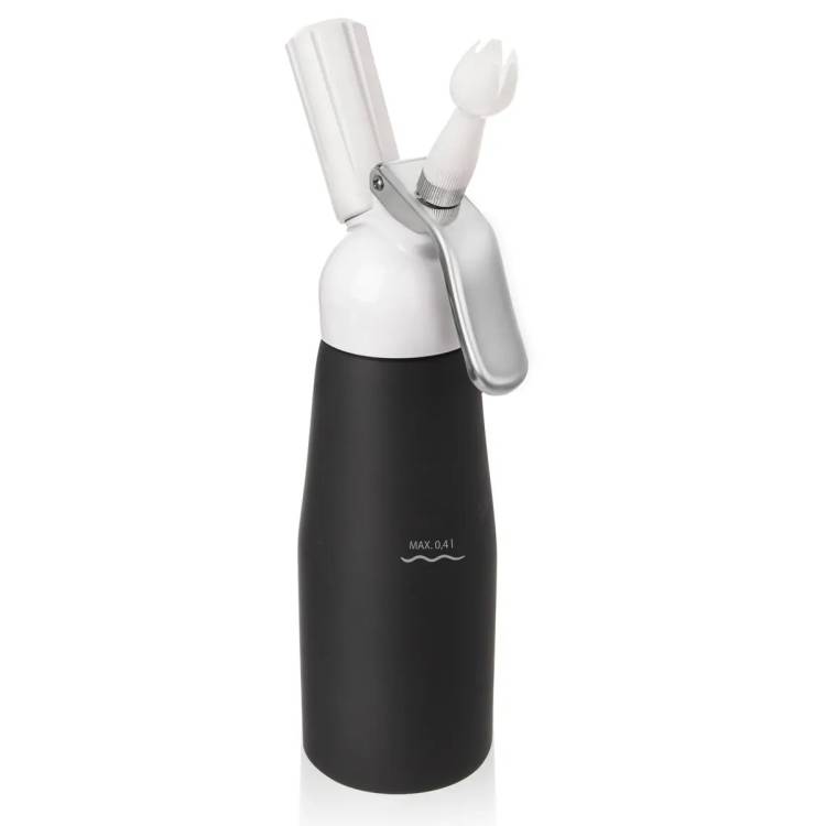 Šlehačková láhev o objemu 0,68 l pro přípravu poctivé domácí šlehačky s třemi nástavci pro přípravu klasické šlehačky ke zdobení sladkých dezertů, ale i slaných pěn, espumy, nebo ke zjemnění omáček.Praktickým pomocníkem, jak si během chvíle připravit kvalitní šlehačku ze smetany ke šlehání, je odolná hliníková nádoba se silikonovým těsněním, se šroubovací hlavou, tryskou, třemi nástavci a čisticím kartáčkem. Díky nim lze vytvořit nadýchanou šlehačkovou ozdobu na vašich dortech, dezertech, palačinkách, vaflích, zmrzlinových a ovocných pohárech, ale zjemníte i omáčky a polévky nebo vytvoříte sladké a slané pěny, espumu. Tato velikost je vhodná pro výrobu a podávání šlehačky o objemu 0,25 l - 0,4 l. Funguje na jednoduchém principu za použití jednorázové bombičky s náplní N2O, které lze zakoupit samostatně, nejsou součástí. Ilustrační foto EAN: 8592381164294