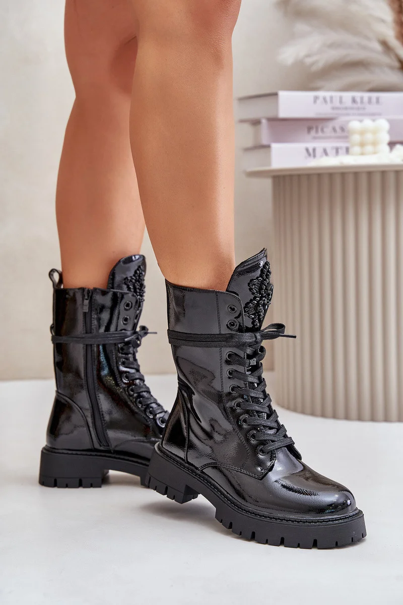 Lakované Zateplené Kotníkové Boty Workery s Ozdobou Černé Kelilea 37
