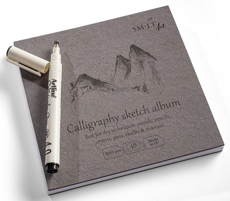 Layflat album Calligraphy "SMLT ART". S bezdřevým vysoce kvalitním bílým nenatíraným papírem. Vysoce hladký povrch a extra lisovaný papír poskytuje vysoký stupeň průhlednosti a jasnou průhlednost archu, který dokonale spolupracuje s linkovanou šablonou. Hodí se pro procvičování kaligrafie se štětcem, fixy, propiskami, paralelními pery, plnicími pery atd. Vyrobeno speciálně způsobem "naplocho" pro jednostránkové kresby nebo panoramatické pohledy. S otevřenou knižní vazbou. Přední a zadní obálka ze z extra tvrdého kartonu v přírodní barvě. Vnitřní papír má certifikaci FSC.