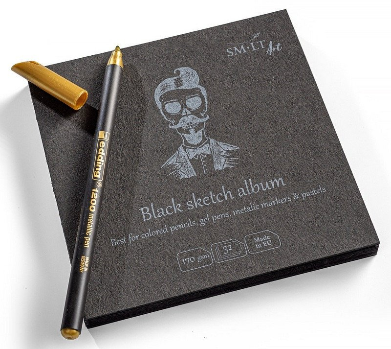 Černé album pro skicování "SMLT ART". S černým hrubým papírem. Papír je vhodný pro barevné tužky, gelová pera, metalické fixy, pastely. S nalepenou zadní stranou z extra tvrdého kartonu přírodní barvy vpředu a vzadu. Stránky lze snadno odstranit, což je ideální pro miniaturní kresby. Vnitřní papír je bezdřevý a certifikovaný FSC.