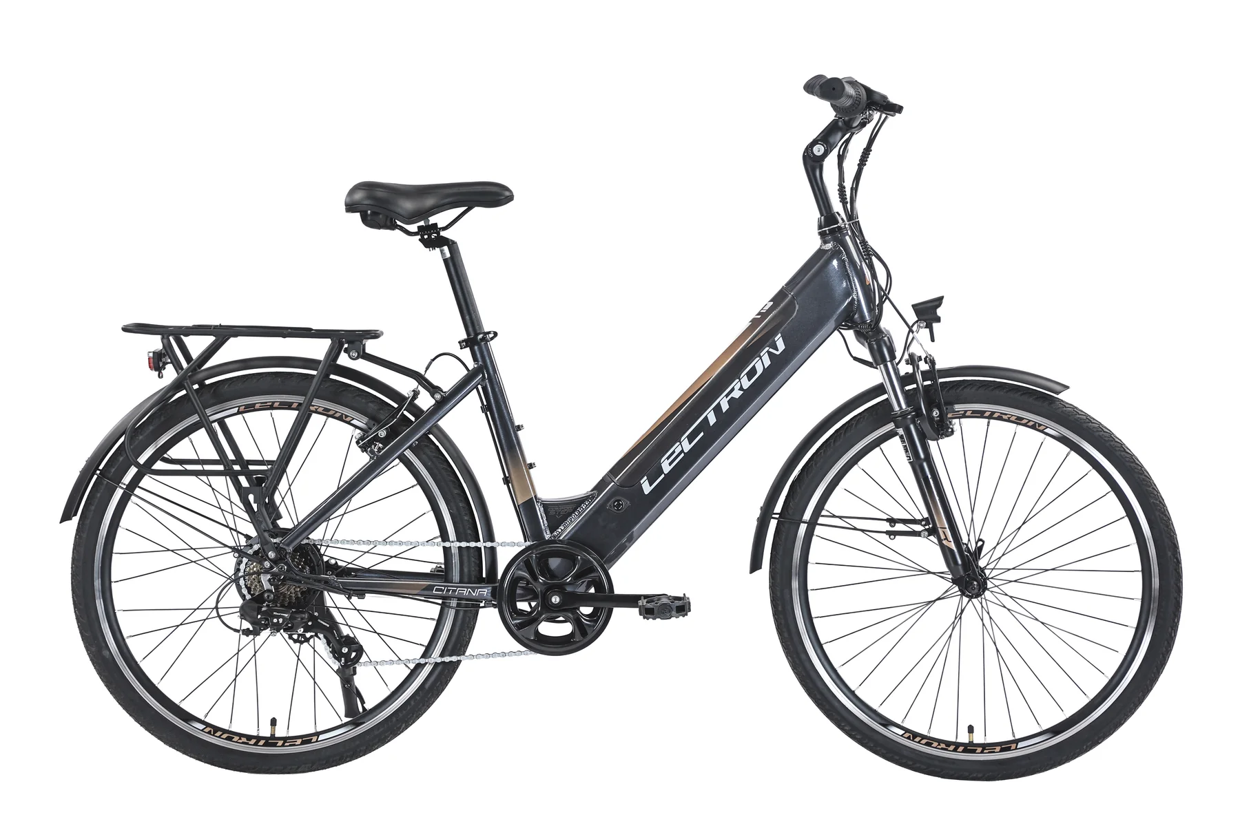 Zdarma dopravné, odborné seřízení a koš FORCE na zadní nosič - kolo od nás je ZDARMA již kompletně seřízené a připravené k jízdě! Záruka nejlepší ceny. Nalezli jste někde lepší cenu? Napište nám na obchod@okolokola.cz a zkusíme ji trumfnout! Městské elektrokolo LECTRON CITANA R Dark, model 2026, pneu 26", baterie 12,8Ah/ 460Wh Dostupné velikosti rámů: 16,5" (S) - výška postavy od cca 150 cm do 165 cm 19" (M) - výška postavy od cca 170 cm do 180 cm Citana R je elegantním elektrokolem s nízkým nástupem a baterií plně integrovanou v rámu. Elegantní elektrokolo pro příměstskou turistiku zaujme nejen baterií skvěle integrovanou v rámu, ale také nízkým nástupem a snadnou ovladatelností. O komfort jízdy se stará výkonný motor v zadním náboji a baterie, která v provedení 12,8 Ah poskytne potřebný dojezd bez nutnosti častého nabíjení. Díky Frekvenční senzory umožňují využít pomoc motoru již při lehkém šlapání. Zesílená stavba rámu poskytuje žádoucí tuhost a jistotu při jízdě. Citana R je vybavena osvědčenými mechanickými V-brzdami Tektro, které nevyžadují žádnou složitou údržbu. Univerzální pláště poskytují jistotu při jízdě po silnici i po prašných cestách. O jízdní pohodlí se stará také pohodlné sedlo a odpružená přední vidlice. Lectron Citana R je elektrokolo s integrovanou baterií, nízkým nástupem a výbornou ovladatelností. Jak vybrat vyhovující elektrokolo? Pár rad jak správně zvolit velikost, na co si dát při výběru pozor a mnohem více naleznete v naší poradně ZDE. Techniská specifikace: Modelový rok: 2026Rám: slitina Alu 6061Velikost rámu: 16,5"/19"Vidlice: Odpružená pružinováHlavové složení: Přehazovačka / měnič: Shimano Tourney 7 rychlostíPřesmykač: Řazení: Převodník: Brzda přední: Tektro V-brzdy C310Brzda přední: Tektro V-brzdy C310Brzdové páky: Brzdové kotouče:Kliky:Středové složení: Pedály:Kazeta / vícekolečko:Řetěz: Řídítka: Představec: Sedlovka: Sedlo: Přední náboj:Zadní náboj:Ráfek přední: 26" dvoustěnné Ráfek zadní: 26" dvoustěnnéPlášť přední: Kenda 26x1,75"Plášť zadní: Kenda 26x1,75"Počet rychlostí: 1 x 7 Hmotnost: 19,7 kg + 3,1 kg baterieNosnost: 120 kgMotor: Odlehčený elektromotor Annanda 250 W / max. 500 W – v zadním nábojiBaterie: 36V / 12,8Ah (460Wh) Li-ion Displej: Nový LED panel (5 stupňů asistence + walk režim)Nabíječka: 6-7 hodin, inteligentní lehká nabíječka 2AMax. dojezd: Až 60 km (dojezd je závislý na podmínkách, terénu a váze jezdce)Poznámka: Přední světlo LED, blatníky, stojan, nosič Změna technické specifikace vyhrazena.