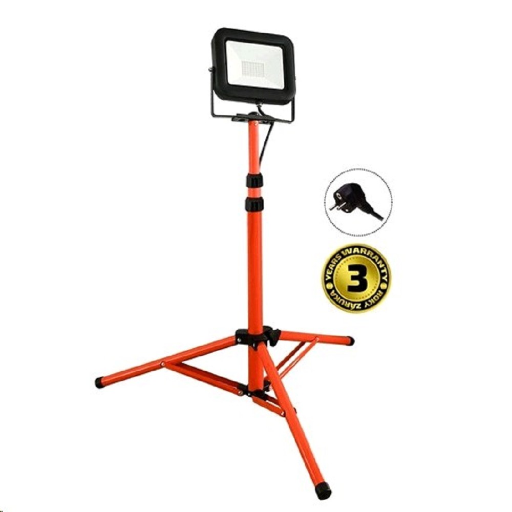 LED reflektor s vysokým stojanem, 50W, 4250lm, kabel se zástrčkou, AC 230V černo oranžový TECHNICKÉ PARAMETRY * Světelný zdroj: 50W LED LG * Světelný tok: 4250 lm * Teplota chromatičnosti 6000K (studená bílá) * Vysoký polohovatelný stojan 62 - 157cm * Životnost: 30.000 hodin * Krytí: IP44 * Světelný kužel: 120° * Přívodní kabel se zástrčkou: 2m * Napětí: AC 100 - 265V, 50Hz * Operační telplota: -40°C až +60°C * Materiál: tlakově litý hliník * Barva: černo oranžová
