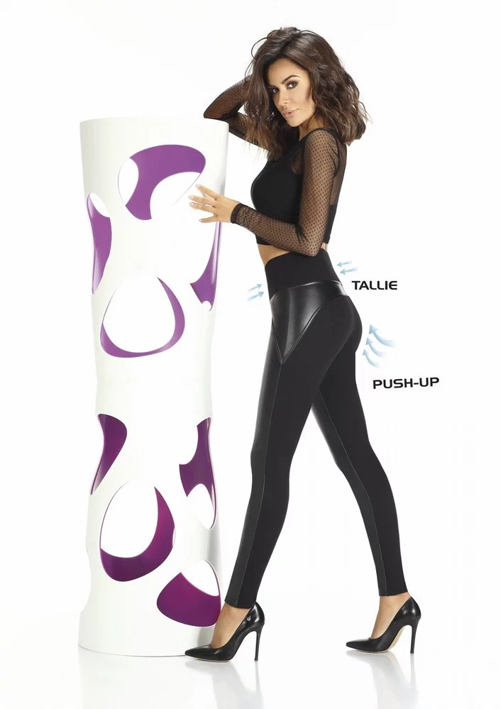 Stylové legíny z elastického materiálu s přídavkem eko-kůže, z materiálu SQUEEZE + ECO LEATHER s efekty push - up pozvedajícím zadeček, pas zpevněný pomocí široké gumy v pase, opticky zeštíhlené nohy. Přední strana je z ekokůže 200 DEN Složení: 62% viskoza, 28% polyester, 10% elastan.