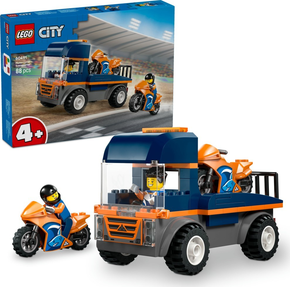 Uveďte děti od 4 let do světa nápaditého hraní se stavebnicí LEGO® City Kamion na přepravu motorek (60491). Tato stavebnice s autíčky obsahuje nákladní auto s plochou korbou a masivními gumovými pneumatikami, 2 sportovní motorky a 2 minifigurky závodníků v helmách. Děti můžou pomocí rampy nakládat a vykládat motorky, hrát si na strhující moto závody s minifigurku usazenou v kabině a užít si zábavná dobrodružství na silnici. Součástí této stavebnice je začátečnická kostka LEGO pro snadné stavění, jednoduché obrázkové pokyny a 3D návod v aplikaci LEGO Builder, která obsahuje nástroje přibližování a otáčení, aby si děti mohly během stavění prohlížet modely ze všech úhlů. Stavebnice představuje zábavný dárek k narozeninám nebo jakékoli jiné příležitosti pro děti, které milují závodění, nápadité hraní a vymýšlení příběhů. Zkombinujte ji s dalšími stavebnicemi z řady LEGO City (prodávají se samostatně) a zažijte ještě více napínavých závodů. Stavebnice obsahuje 88 dílků. • HERNÍ STAVEBNICE PRO DĚTI OD 4 LET – LEGO® City Kamion na přepravu motorek (60491) je zábavná stavebnice pro děti od 4 let, které milují modely nákladních aut a závodní hračky • CO NAJDETE V KRABICI – Vše, co děti potřebují k sestavení hračky v podobě kamionu s plochou korbou, 2 motorek a 2 minifigurek řidičů, které podnítí jejich fantazii a inspirují je k nápaditému hraní a vyprávění • DĚTSKÉ HRAČKY PRO HRY NA ROLE – Děti můžou minifigurku posadit do kabiny kamionu s plochou korbou a připojit rampu, aby naložily nebo vyložily 2 modely motorek • HERNÍ DOPLŇKY – Tato stavebnice obsahuje herní doplňky pro minifigurku LEGO®, včetně hasáku, hrnku a telefonu • NÁPAD NA DÁREK PRO DĚTI – Oslavte narozeniny nebo jakoukoli jinou výjimečnou příležitost s touto stavebnicí vozidel pro holky a kluky od 4 let • VAŠE MĚSTO, VAŠE PRAVIDLA – Děti si užijí ještě více zábavy, když tuto stavebnici spojí s dalšími stavebnicemi z řady vozidel LEGO® City (prodávají se samostatně) • PRAKTICKÝ POMOCNÍK PRO MALÉ STAVITELE – Součástí je začátečnická kostka LEGO®, jednoduchý obrázkový návod a 3D digitální návod v aplikaci LEGO Builder • ROZMĚRY – Stavebnice se skládá z 88 dílků a model kamionu s plochou korbou měří přes 8 cm na výšku, 14 cm na délku a 7 cm na šířku