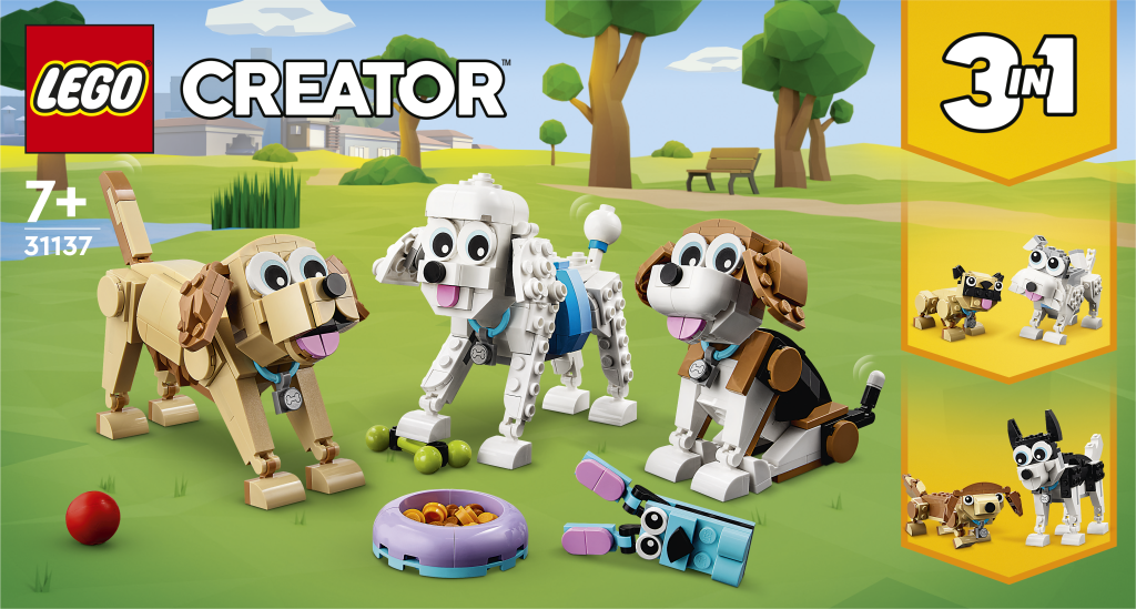 Dokonalá stavebnice pro milovníky psů! Postavte si bígla, pudla a labradora a užijte si zábavu v parku s balónkem a vodítkem. Potom je přestavějte na miniaturního knírače a mopsíka nebo na huskyho a dlouhosrstého jezevčíka. Je jen na vás, jaké chlupáče si z této stavebnice 3 v 1 vyberete.