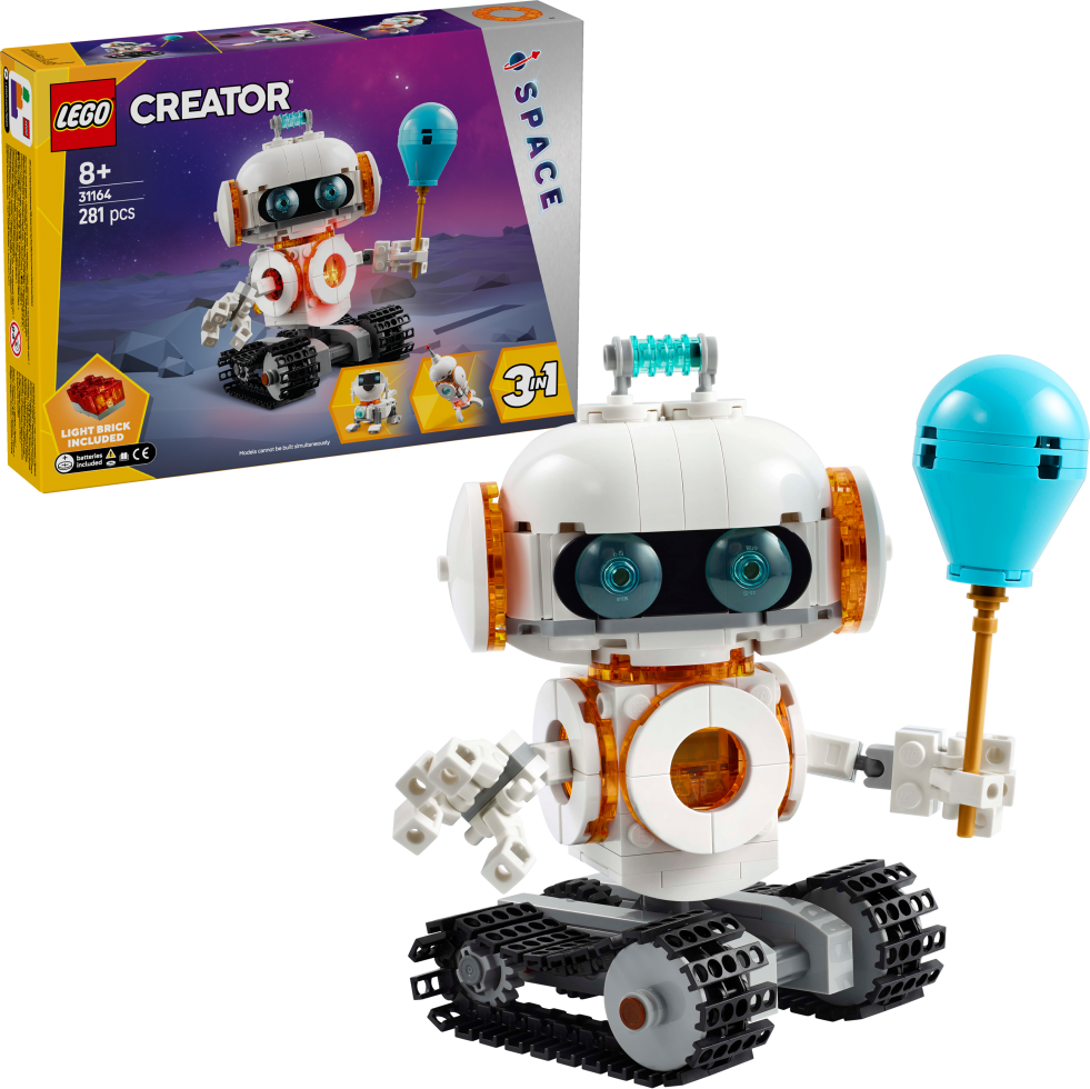 3 vesmírné modely v 1 krabici – Se stavebnicí LEGO® Creator 3 v 1 Vesmírný robot si kluci a holky od 8 let postaví a přestaví 3 různé modely ze stejných kostek Rozmanité herní možnosti – Děti se vydají na mezigalaktická dobrodružství se 3 různými stavebnicemi (modely nelze stavět současně): vesmírným robotem, figurkou vesmírného psa a vesmírnou raketou Pohyblivé vesmírné figurky – Model robota má pohyblivé ruce a prsty a otáčecí hlavu a tělo a vesmírný pes má otáčecí hlavu a 4 polohovatelné nohy Osvětlené modely – Všechny 3 vesmírné modely LEGO® se rozsvítí, když děti stisknou speciální světelnou kostku (baterie jsou součástí balení) Dárek pro děti s robotem – Tato stavebnice 3 v 1 milovníkům vesmíru přináší stavitelský a herní zážitek a představuje krásný dárek k narozeninám, se kterým si užijí hodiny nápaditého hraní 3 porce zábavy v 1 – Užijte si ještě více dobrodružství s dalšími stavebnicemi z řady LEGO® Creator 3 v 1 (prodávají se samostatně) Hračky LEGO® Creator 3 v 1 – S každou ze stavebnic 3 v 1 si děti postaví 3 různé modely inspirované jejich zájmy, včetně zvířat, vozidel a domů Rozměry – Tato vesmírná stavebnice LEGO® se skládá z 281 dílků a součástí je sestavitelný model robota z kostek LEGO®, který měří přes 13 cm na výšku.