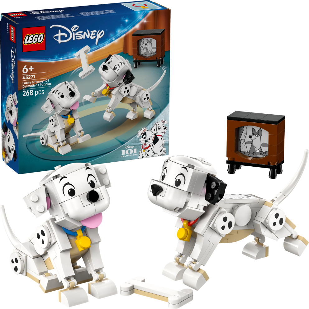 Potěšte děti nebo milovníky zvířat od 6 let stavebnicí LEGO® ǀ Disney (43271) Štěňátka Štístko a Penny z filmu 101 dalmatinů. Tato stavebnice je plná herních možností a obsahuje 2 štěňata dalmatinů z klasické Disney pohádky 101 dalmatinů, kost z kostek a malou televizi. Postavičky štěňátek LEGO ǀ Disney mají pohyblivé hlavy, nohy a ocasy a lze je napolohovat různými způsoby. Tato roztomilá stavebnice představuje skvělý dárek pro holky, kluky a fanoušky filmů od studia Disney. Lze ji kombinovat s dalšími stavebnicemi LEGO ǀ Disney z této řady (prodávají se samostatně) a skvěle se hodí i na hraní na cestách. Dospělí fanoušci Disney, kteří mají rádi roztomilé pejsky, se navíc můžou připojit k dětem a postavit si náročnější doplňkovou stavebnici (Štěňátko z filmu 101 dalmatinů pro dospělé, prodává se samostatně). Děti se můžou vydat na nenáročné a intuitivní stavitelské dobrodružství s aplikací LEGO Builder. V ní si lze přibližovat a otáčet modely ve 3D, ukládat stavebnice a sledovat postup. Stavebnice obsahuje 268 dílků.