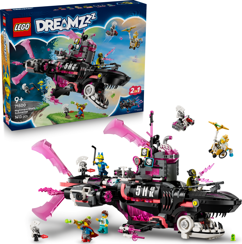 Děti se ponoří do Světa snů se stavebnicí LEGO® DREAMZzz™ (71500) Žraločkoponorka z nočních můr pro kluky a holky od 9 let. Tato fantastická stavebnice plná parádních detailů umožňuje fanouškům vychutnat si velkolepá dobrodružství pod mořskou hladinou po boku Matea, Logana a Astrid. Malí snílci si postaví model žraloka a pak ho promění na žraločkoponorku nebo bitevní loď se žraloky kladivouny. Mezi detaily stavebnice patří odnímatelná miniaturní letadla, vystřelovače, rakety, které lze vystřelit ze žraločí tlamy, otevírací kokpit a vězení uvnitř žraloka. Součástí jsou také modulární vystřelovače kompatibilní s dalšími stavebnicemi z řady LEGO DREAMZzz 2025 (prodávají se samostatně). Minifigurky Matea, Logana, Astrid, Rozbíječe snů, snílků a figurky Z-Fleka a 3 Kybervěcí vdechnou stavebnici život a podnítí kreativní hraní. Součástí napínavé stavebnice je návod na stavění vedený příběhem, se kterým se děti ponoří do dobrodružství ve Světě snů a stanou se hrdiny.