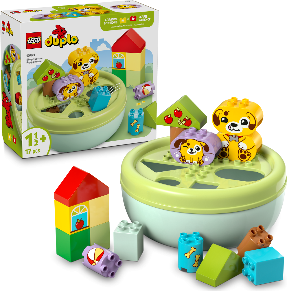 Darujte malým milovníkům pejsků kouzelnou stavebnici Třídění tvarů: Domeček pro štěňátka (10441), která přináší hned dvě možnosti hraní. Tato hračka pro děti od 18 měsíců pomáhá rozvíjet jemnou motoriku a děti s ní objeví nové tvary. Stavebnice navíc rozvíjí dovednost řešení problémů, když děti z kostek postaví místo na hraní pro štěňátka a pak si vyzkouší vhazování kostek různých tvarů do víka misky. Tento dárek pro batolata pomáhá rozvíjet prostorovou orientaci a je nabitý zábavnými vzdělávacími aktivitami pro celou rodinu. Rodiče můžou dětem ukázat všechny tvary v balení, které pak malí stavitelé použijí ke stavění stromů, figurek psů a dokonce i domu. Pak si užijí kreativní hraní s roztomilými pejsky LEGO® DUPLO®, hodí jim míč a nakrmí je kostí. Až nápadité stavitelské dobrodružství skončí, děti si užijí spoustu zábavy při třídění tvarů. Procvičí svou schopnost soustředění při hledání děr, do kterých se vejdou jednotlivé kostky. A pokud se jim to napoprvé nepovede, procvičí trpělivost a koordinaci očí a rukou při snaze najít ten správný otvor. Obsahuje 17 dílků.