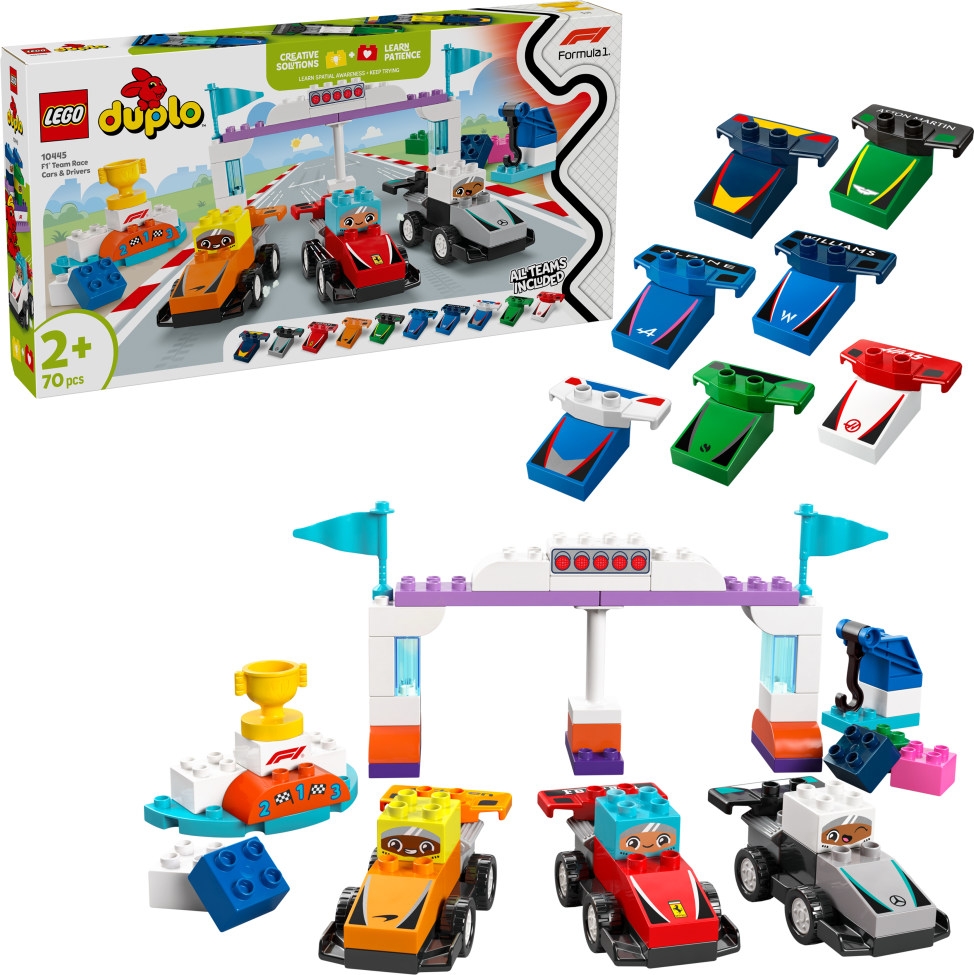 Stavebnice závodního auta pro kreativní hraní – Vydejte se s dětmi do světa Formule 1® se stavebnicí Závodní auta a řidiči týmu F1® Kreativní zábava pro celou rodinu – Podělte se o svou lásku k F1® se svou ratolestí s touto hračkou pro malé děti, která obsahuje 10 sestavitelných závodních aut, 3 kostky s řidičem, jeřáb, světla na startu a stupně vítězů Realistická závodní auta – Tato přizpůsobitelná auta mají autentické barvy a zdobí je loga Formula 1® a děti se s nimi vydají na realistické závody F1® Jeřáb pro ještě více dramatičnosti – Děti si postaví napínavé momenty ze zastávky v boxech a připevní auta k háku, aby je zvedly a provedly expresní kontrolu Dárky pro děti od 2 let – Oslavte začátek sezóny F1® nebo darujte malým závodníkům kreativní dárek, který byl důkladně testován, aby přinesl bezpečný herní zážitek Rychlejší F1® – Nenechte si ujít i další stavebnice LEGO® Formula 1® (prodávají se samostatně), které si můžete postavit, vystavit a závodit s nimi s celou rodinou Stavebnice pro rozvoj dovedností – Všechny stavebnice LEGO® DUPLO® jsou navrženy tak, aby pomáhaly rozvíjet dovednosti, a s touto stavebnicí děti zdokonalí svou prostorovou orientaci, koordinací ruka-oko a jemné motorické schopnosti Rozměry – Tato vzdělávací stavebnice pro malé děti se skládá ze 70 dílků a součástí je osvětlená startovní brána, která měří přes 16 cm na výšku, 38 cm na šířku a 6 cm do hloubky.