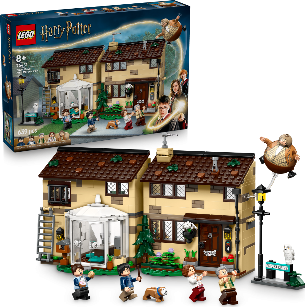 Znovu prožijte návštěvu tety Marge v Zobí ulici 4 z filmu Harry Potter a vězeň z Azkabanu s touto sběratelskou stavebnicí LEGO® Harry Potter™ (76451). Sestavitelný dům se zimní zahradou je propracovanou replikou rodinného domu Dursleyových a lze ho otevřít pro snadný přístup do interiéru. V kuchyni s jídelnou najdete odnímatelný stůl, v zadní části domu tajné dveře do Harryho starého pokoje pod schody, na okně Harryho pokoje v horním patře najdete odnímatelné mříže, se kterými si můžete připomenout scénu Harryho útěku, a nechybí spousta dalších autentických doplňků, které inspirují ke kreativnímu hraní. Tato fantastická dobrodružná stavebnice představuje kouzelný vánoční nebo narozeninový dárek pro kluky, holky a fanoušky od 8 let a obsahuje 5 minifigurek LEGO Harry Potter a figurku psa Raťafáka. Nechybí ani figurka nafouknuté tety Marge z vtipné scény, ve které na ni Harry sešle kouzlo, po kterém se nafoukne jako balón. Součástí je také menší model s nápisem „Privet Drive“ („Zobí ulice“) a pouličním osvětlením.